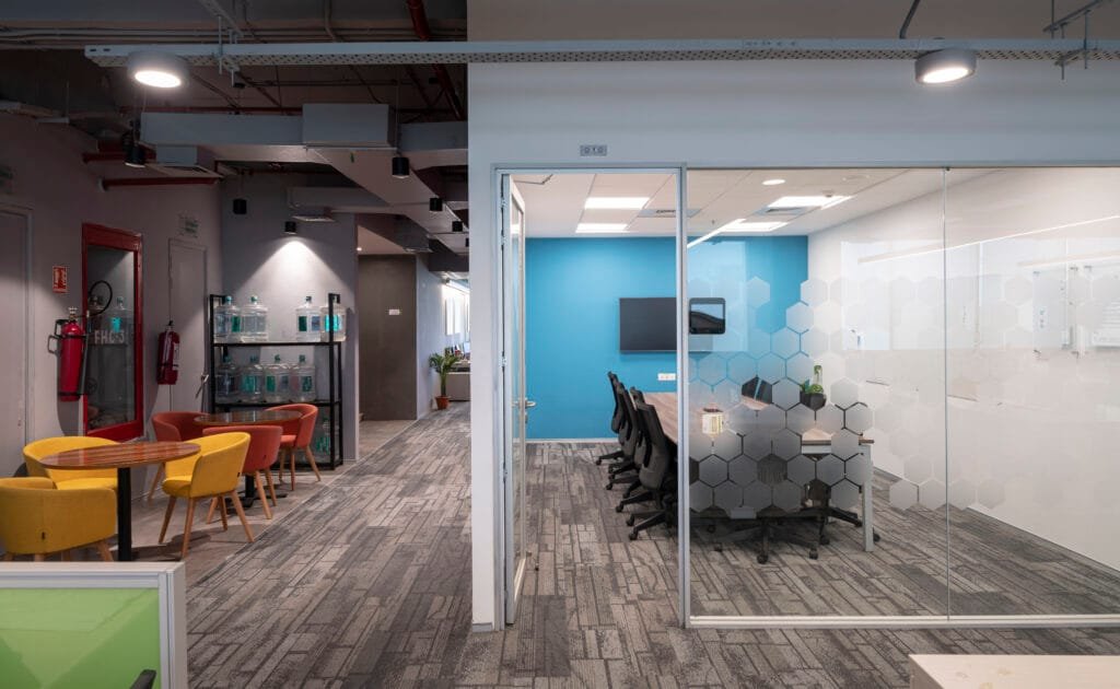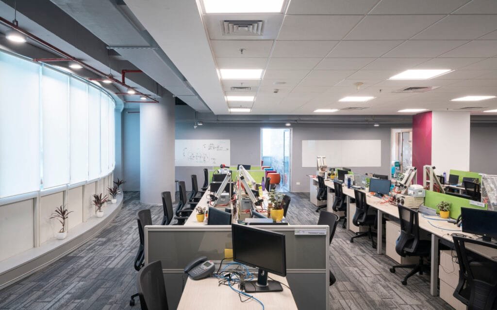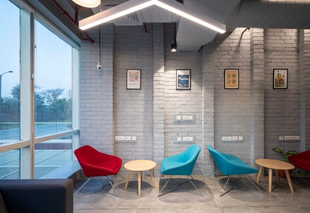 The peripheral industrial zones along the glazings are largely grey with exposed services. Colors have been used strategically in the central zone to provide a vibrant visual experience. The brand colors of the company have been extensively used in the office. The carpet is industrial in look to provide a strong neutral base. The boardroom and NOC Room boast of an accent green carpet to highlight these spaces. The general and laboratory furniture was custom designed to suit the various functional requirements. Bold colours have been used in soft furniture, furnishings and graphics. The lux levels, fresh air change cycles and acoustics have been designed to create an efficient and productive work environment.
