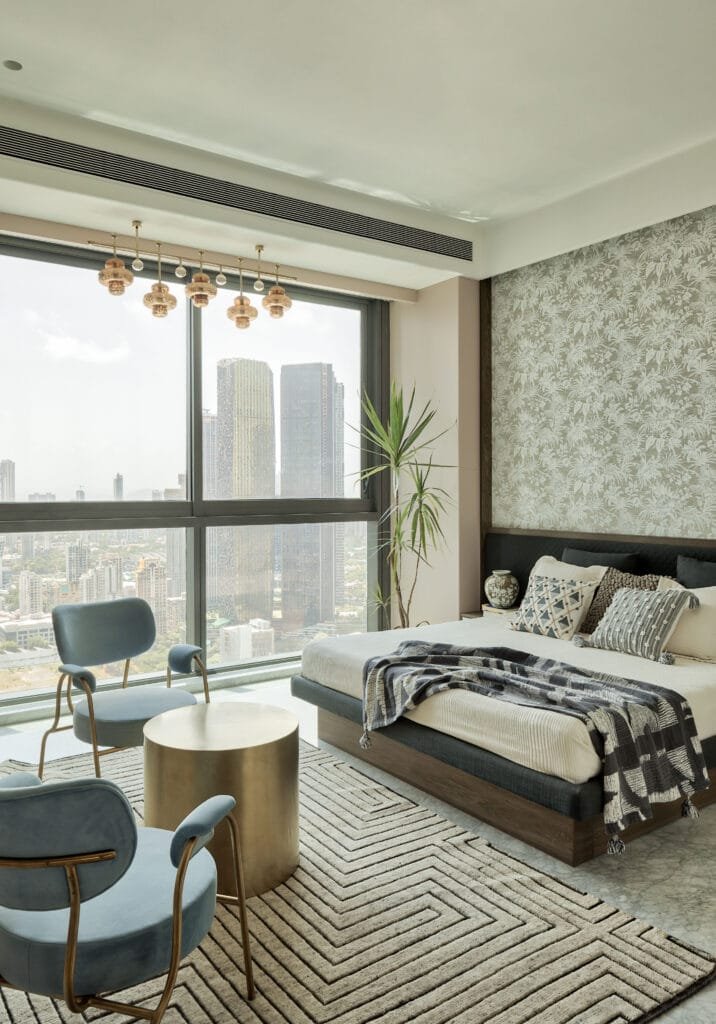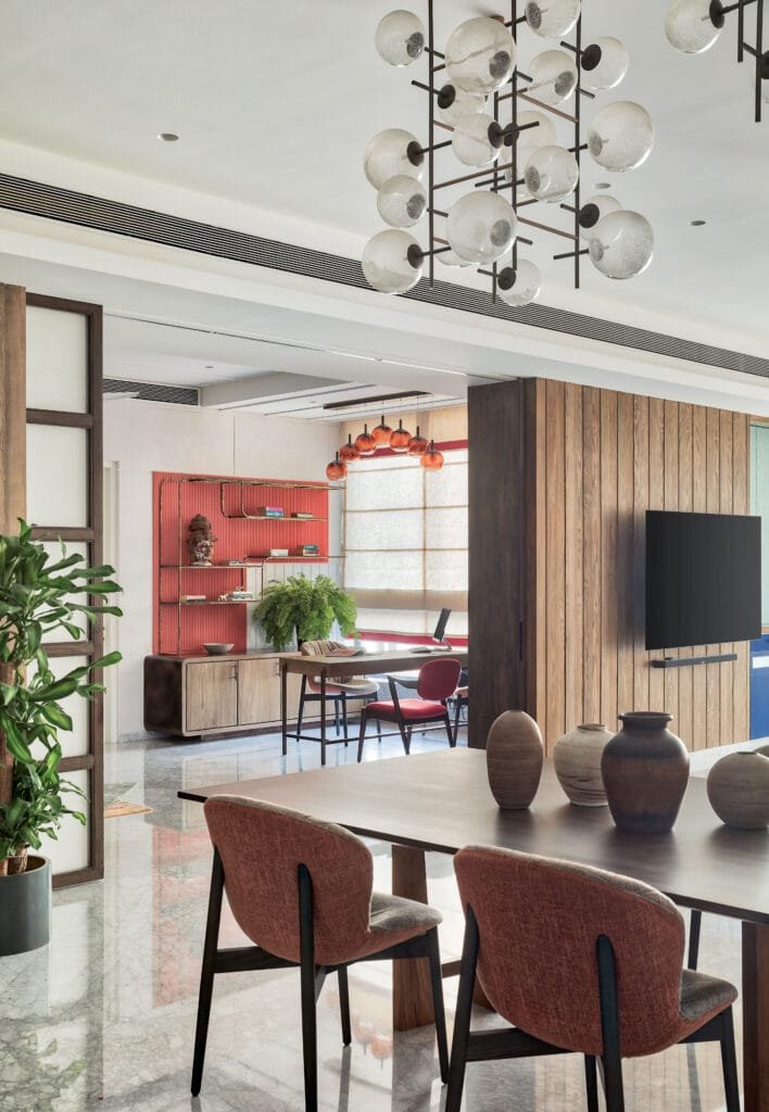 Designed by Rutam Intarch, though officially a three-bedroom home, its layout carries the flexibility of a fourth room that doubles as a study. Sharing insights on the design plan, Sheffalie Jhaveri, Designer, Rutam Intarch, says, “The plan integrates a living and dining area, kitchen, staff room, and three en-suite bedrooms, with circulation and scale carefully considered to balance openness with utility. A six-foot-wide entry passage was transformed through the use of Bog Elm veneer panelling, concealing storage seamlessly within its grain and establishing the home’s understated richness from the very first step inside. The living and dining space flows into the home office through massive L-shaped sliding doors, which allow the room to merge effortlessly into the entertainment zone when required. Balconies extend the living spaces outward, bringing in light, air, and panoramic sea views that animate the interiors.”