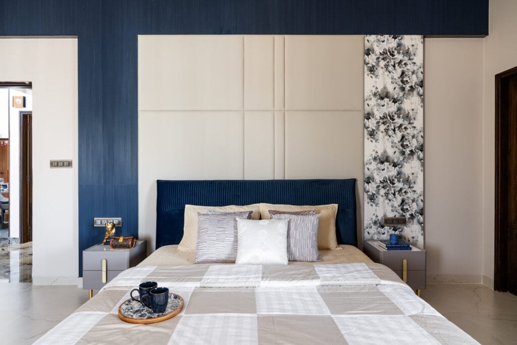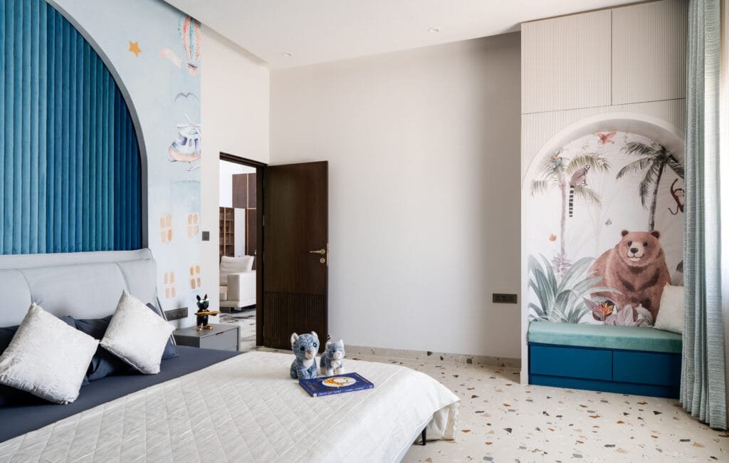 The bedrooms are layered yet light. The master suite is a quiet retreat, wrapped in floral wallpapers, leather panelling, and blue fluted accents that orchestrate intimacy without visual fatigue. The children’s room tells a more playful story — fluted suede arches, aviation-themed wallpaper, and a cosy jungle nook compose a narrative of discovery, grounding design in imagination.