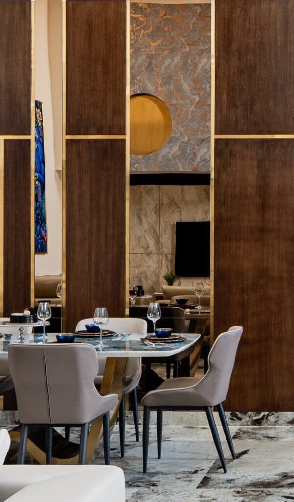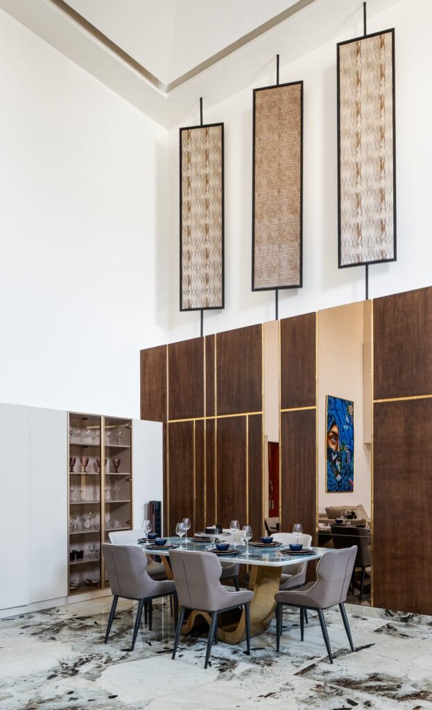 The dining area is the emotional anchor of this double-height core. A tall fabric-panelled wall, angled within sleek metal frames, rises with quiet grandeur behind an exotic blue marble table — its rich veining and tonal depth creating a visual echo with the cobalt art. Sleek grey dining chairs, slit-backed with leather detailing, complete the composition with understated elegance. Here, scale, materiality, and tone collide in curated harmony.