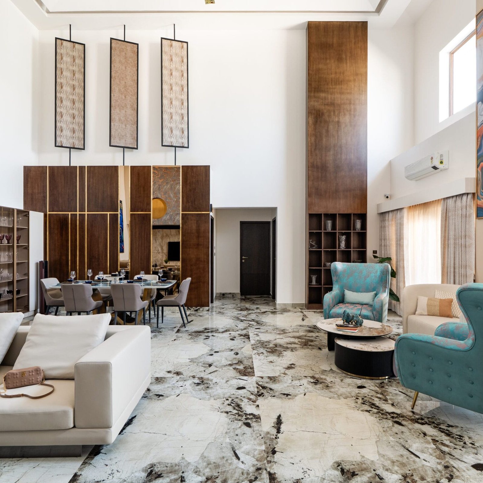 Throughout the living and family zones, a tone-on-tone narrative unfolds. Marble-topped centre tables echo the flooring’s Patagonian white palette, creating cohesion across disparate elements. On one end, a veneered showcase displays crystal artefacts in rich contrast, while the opposite wall hosts a playful bar nook set against custom peacock-motif wallpaper — anchored by an embroidered teal accent chair that speaks softly of heritage, filtered through a modern lens.