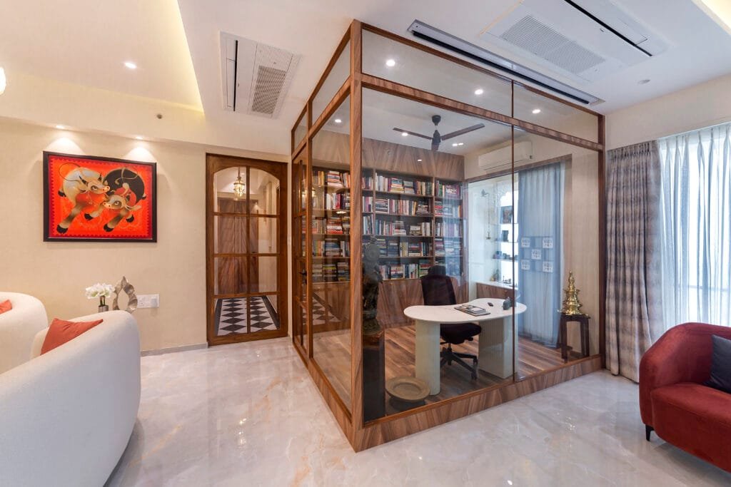 Stepping inside, a dramatic welcome unfolds. The entrance door, a study in refined contrasts, features a luxurious marble finish juxtaposed with louvered wood panels and an intricate leaf-shaped grill. This leads into a striking black and white checkered foyer, where a grand piano and an audacious “amore red” bar immediately set a tone of convivial sophistication. Above, a magnificent chandelier cascades light onto a rich wooden ceiling panel, amplifying the grandeur of this wide entryway. “A venerable antique Lakshmi idol finds its place in a cleverly integrated archway, artfully bridging the two former separate apartment into a cohesive grand space. The seamless design continues with a discreetly hidden door for the household. louvered panel. The visual journey culminates at a stately marble wall panel, featuring a bold gold elephant ornament – a powerful symbol of the family’s heritage – elegantly flanked by their treasured artworks.” explains Smita Vijaykumar, Founder, ReNNovate Interiors.