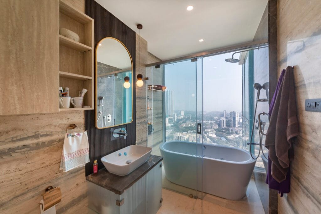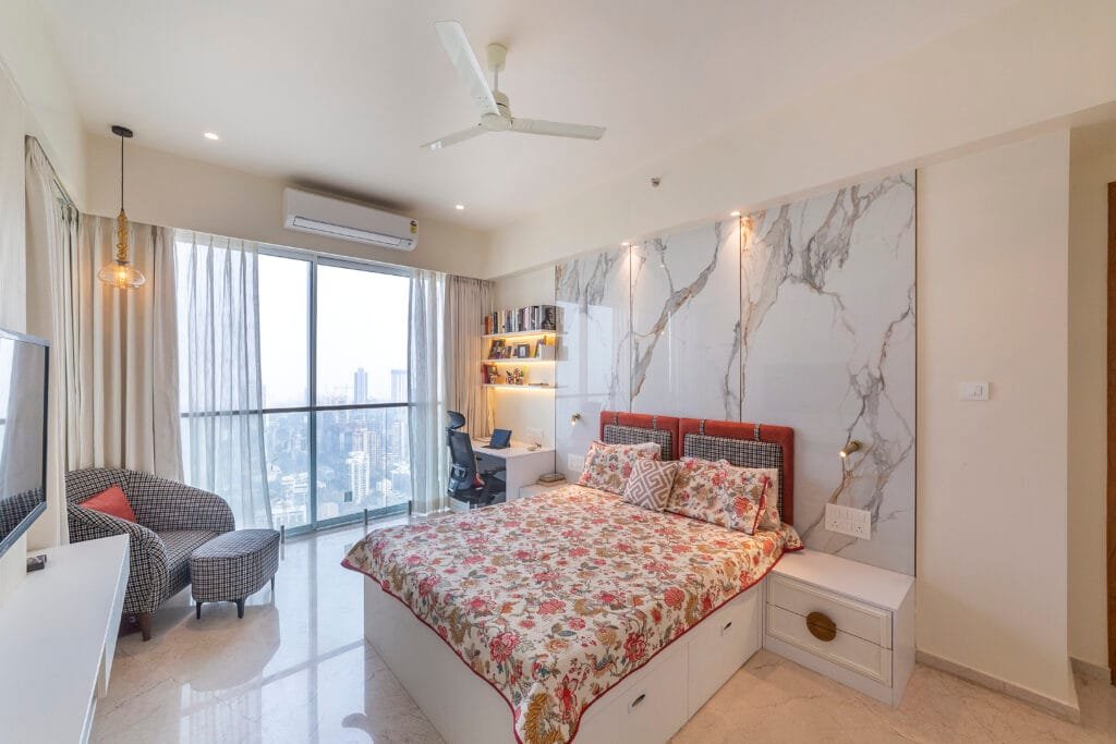 Each bedroom offers a unique narrative of luxury and comfort. The master suite is a haven of white, featuring a stunning Statuario white marble bed backdrop and a tactile fluted TV panel. The wardrobes boast a sophisticated stucco finish, complemented by exquisite custom-ordered brass handles for all the bespoke furniture. The ultimate indulgence is the travertine bathroom, offering breathtaking panoramic views of the Mumbai skyline. The interplay of wood and travertine creates a subtly contrasting and visually rich experience, with all storage seamlessly concealed within matching travertine finishes.