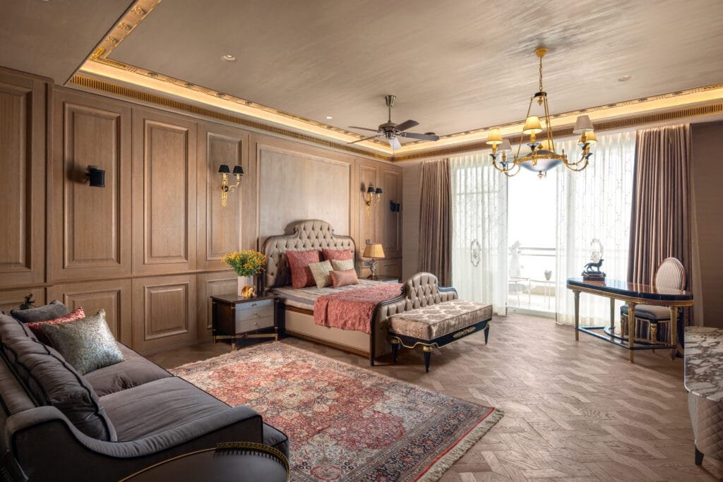 “Light was treated as a material in itself. Daylight filters through stained glass and onyx screens, shifting moods from morning clarity to evening softness. This natural play was complemented with carefully layered artificial lighting, chandeliers and sconces from Laudarte, lamps with French gold finishes, and targeted accents to illuminate art and architectural details. The intent was always to create glow rather than glare, warmth rather than brightness.” Sandeep Uppal, Principal Architect, Sandeep Geeta & Associates