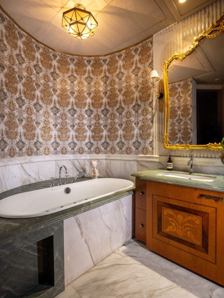 The bedrooms are designed as sanctuaries of rest. Wooden flooring from Poland introduces warmth underfoot, while light grey bardiglio and Carrara surfaces provide structure and calm. In the master suite, brass-framed mirrors and select furniture from Italian ateliers add refinement without noise. Each bedroom is deeply personal, finished with understated tones that allow light and art to take precedence.