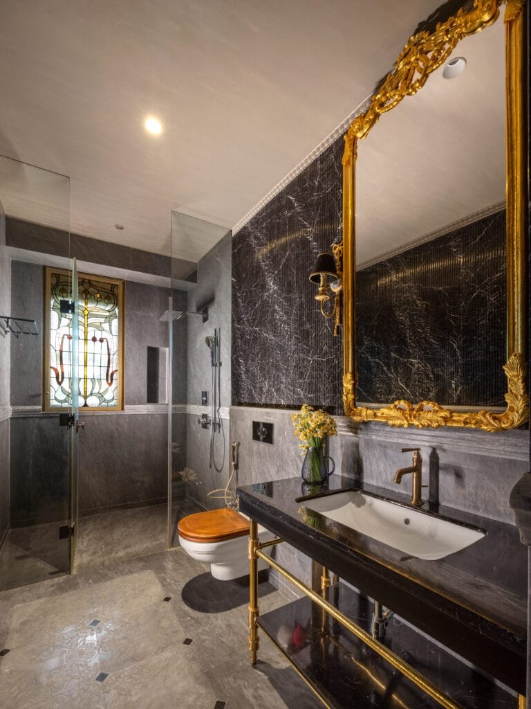The puja space was given particular care. The gilded Art Deco temple stands against a backdrop of lead marble, intimate yet dignified. It is a quiet pause in the home, respectful in scale and detail, embodying reverence without overpowering the surrounding interiors.