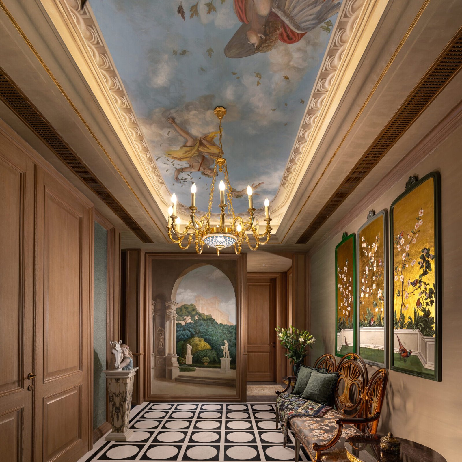 As you step inside, the coffered ceiling in the lift lobby introduces you to a realm inspired by the architectural wonder of Rome. Crafted in a way that echoes the structural beauty of the Pantheon, this ceiling is a prelude to the artistry within. The gaze naturally drifts upward, where frescoed ceilings—painted by artisans who brought their decades-old expertise from Italian cathedrals—transform light and shadow into a constantly shifting tapestry. It’s a ceiling that feels alive, bringing the serenity of the Renaissance right into the heart of Gurgaon.