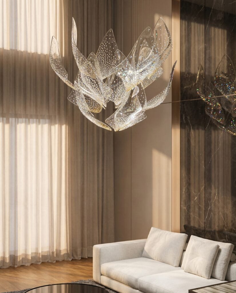 Anchored in the concept of anticipation, The Hour Before explores the subtle transition between stillness and experience. Key collections such as Pearl and Flux Celestial take centre stage – where textured slumped glass, organic crystal forms, and hand-placed glass elements come together to reflect shifting atmospheres, from underwater serenity to celestial movement. Each installation invites visitors to pause, observe, and connect with light as an emotional and spatial element rather than just a functional one.