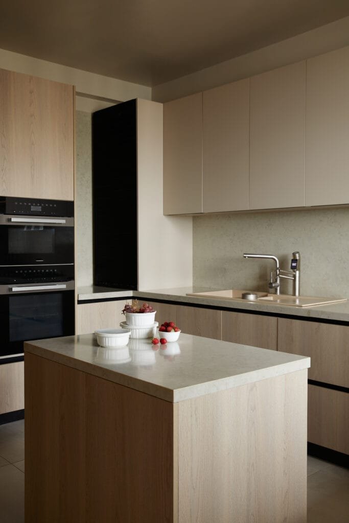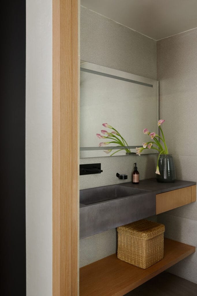 Tucked next to the dining area, the powder room takes on a deeper, more immersive tone. Here, fluted stone with bold veining forms a dramatic backdrop, paired with an organically shaped mirror and a custom-made concrete basin from Nuance Studio. The composition is sculptural and striking, turning the small space into a quiet spectacle.