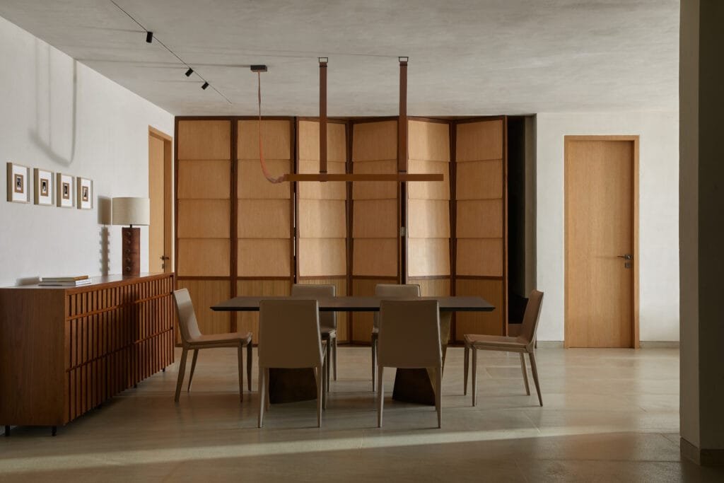 From the foyer, the home opens up with quiet confidence – clean lines and no excess, just a measured rhythm of space and surface. The same lime plaster that wraps the walls flows onto the ceiling to create a gentle and seamless shell. Thought is given to every surface; nothing is incidental. Each element – whether wall, floor or ceiling – is composed to contribute to a sense of warmth. Underfoot, a sandblasted beige sandstone from Rajasthan sourced by Stonelife grounds the space with its muted grain. On one side, a snug living area takes shape with upholstered sofas; on the other, the dining and bar spaces open up – subdued yet inviting. The dining area feels serene and composed, with a long table anchored under a linear pendant light and sleek chairs that maintain the room’s understated clarity. A two-toned wood louvered partition offers privacy to the adjacent media room without closing it off entirely. The bar area features a simple wood and stone console, complemented by shelves above that display everyday, personal objects. Between the living and dining zones, the pooja space is enclosed within a louvered fluted glass screen – designed to preserve intimacy while allowing the fragrance of incense to linger gently through the home.