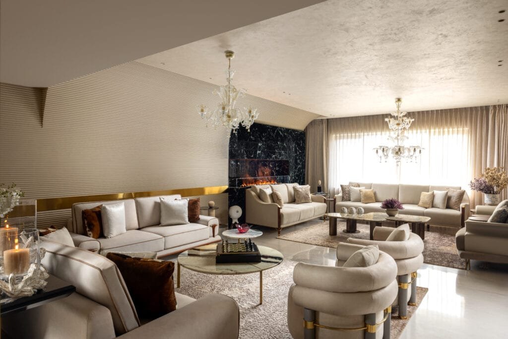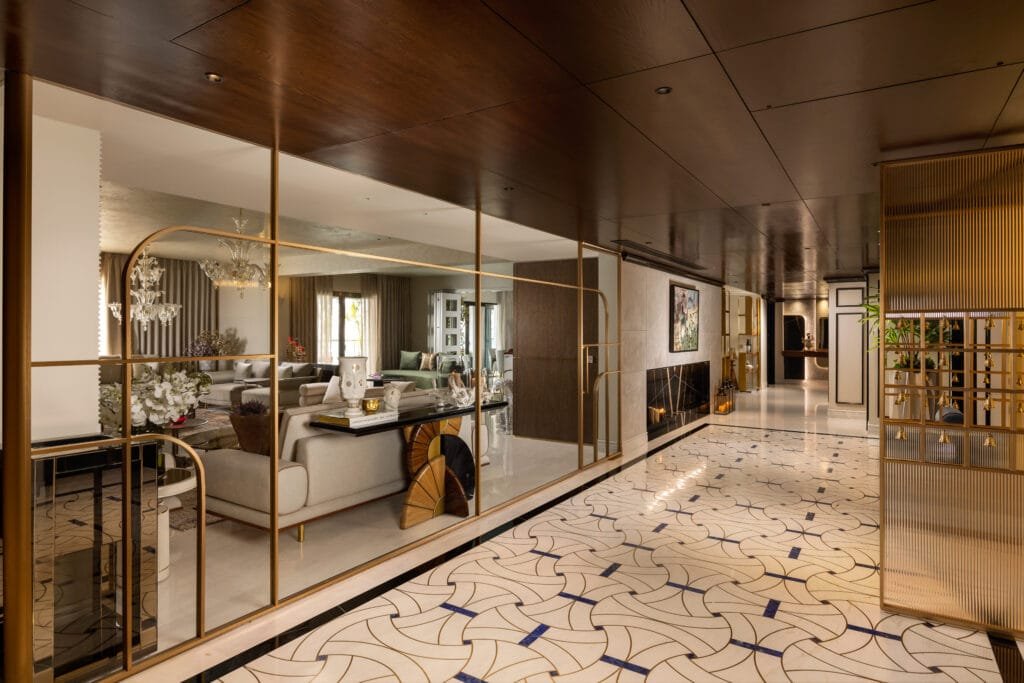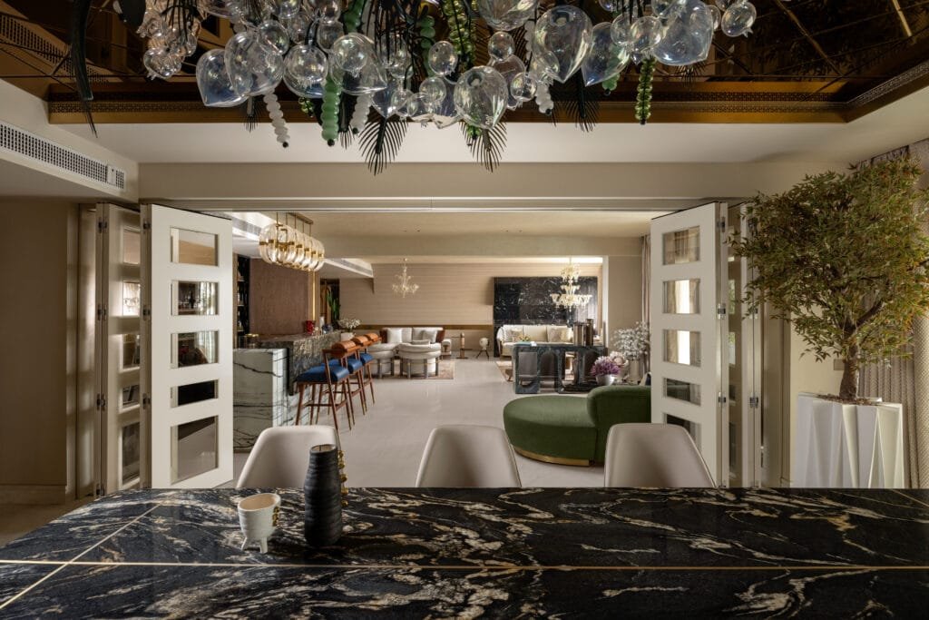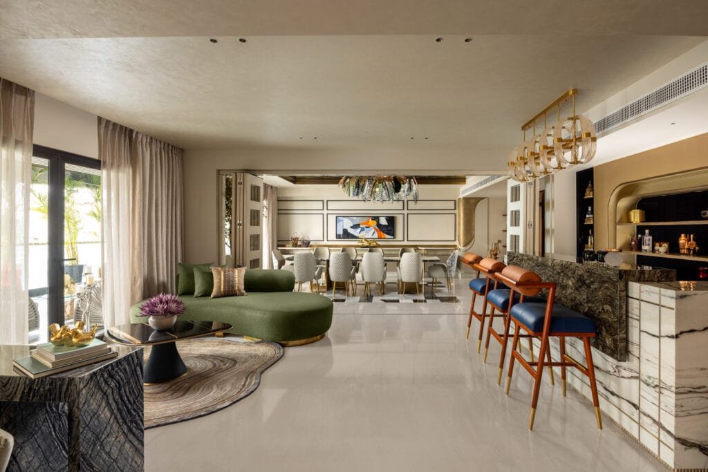 Entertaining was a key priority, which is evident in the sleek, sculptural bar area with rich marble textures and statement lighting. The living area was designed to feel plush and welcoming, with layered lighting, soft textures, and organic forms creating a warm, conversational ambience. A major highlight is the lobby, where bespoke craftsmanship comes alive through the inlay flooring with brass detailing and the artisan-crafted ceiling, reflecting the client’s appreciation for Indian handwork. Overall, the project captures a contemporary global sensibility with rooted Indian artistry, resulting in a space that feels bespoke, vibrant, and timeless. “Each zone, from the sculptural bar to the layered living area, is treated as a curated experience with its own identity, while maintaining a cohesive design language through warm neutrals, sculptural lighting, and bespoke detailing”, shares Parnika. The 12-seater grand dinning with customised quirky chandelier from Klove Studios, adds elegance to the space. This space has 3 buffet counters to assist the clients while hosting a big gathering of guests. A green and brown colour palette of the entertainment room lends a gentlemen’s club vibe feel to this space with antique accessories and black & white family portrait adding a vintage vibe. The family lounge has a bold colour combination of green and brown, breaking the monotony and giving a bolder look to the space. She further informs, “The bi-fold collapsible doors in the formal area helps divide the dining to drawing when needed and also when opened shows the expanse of the space. The lobby acts as a cultural focal point, celebrating Indian artistry with intricate ceiling handwork by Jaipur artisans and handcrafted brass inlays in the floor. Lighting plays a transformative role, with dramatic chandeliers and ambient glow elevating the mood. The project’s core concept was to create a luxurious yet soulful space where every room tells a story”
