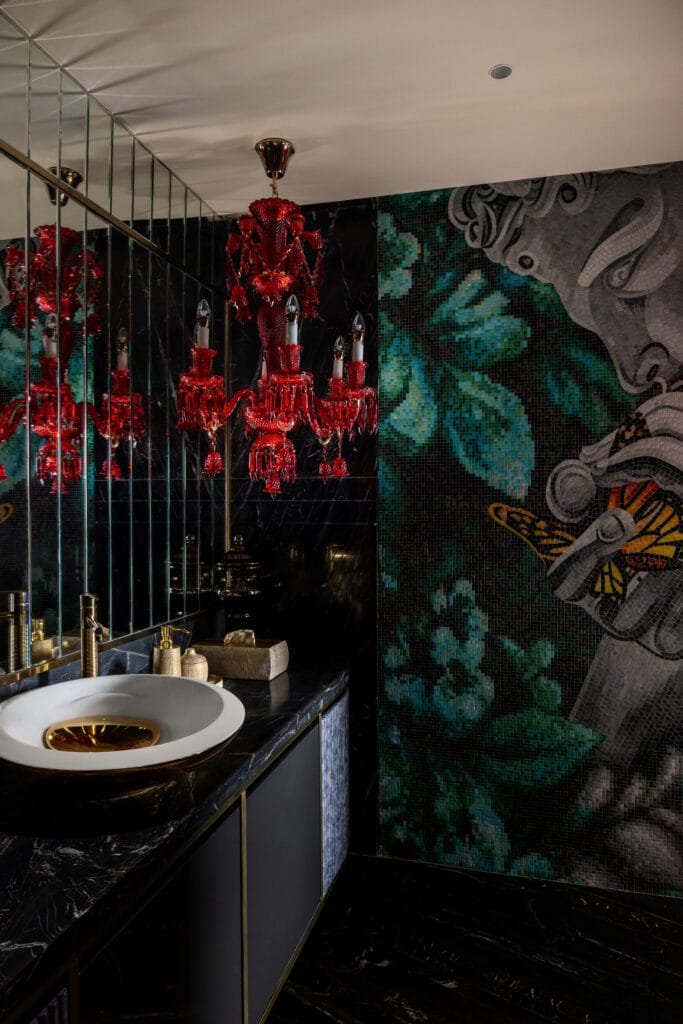 The design process for this project was rooted in the idea of creating distinct, immersive experiences in every space while maintaining a cohesive design narrative. Each room was treated as a canvas to reflect a unique mood and function, carefully crafted through materials, colour, and storytelling elements. The soft pastel bedroom celebrates femininity and calm, with floral textures, curved forms, and elegant lighting accents. In contrast, the powder room is bold and dramatic, designed as an artistic statement with a Romanesque mosaic mural, vibrant red chandelier, and natural landscaping— blending luxury with gallery-like intrigue. The son’s bedroom with rugged unfinished walls created through textured paint and acrylic material walls. Meanwhile, the den takes a moody, vintage turn with deep green walls, classic tufted furniture, and a curated gallery wall, evoking an old-world charm. The process involved close collaboration with artisans, attention to lighting, and thoughtful layering of textures and finishes.