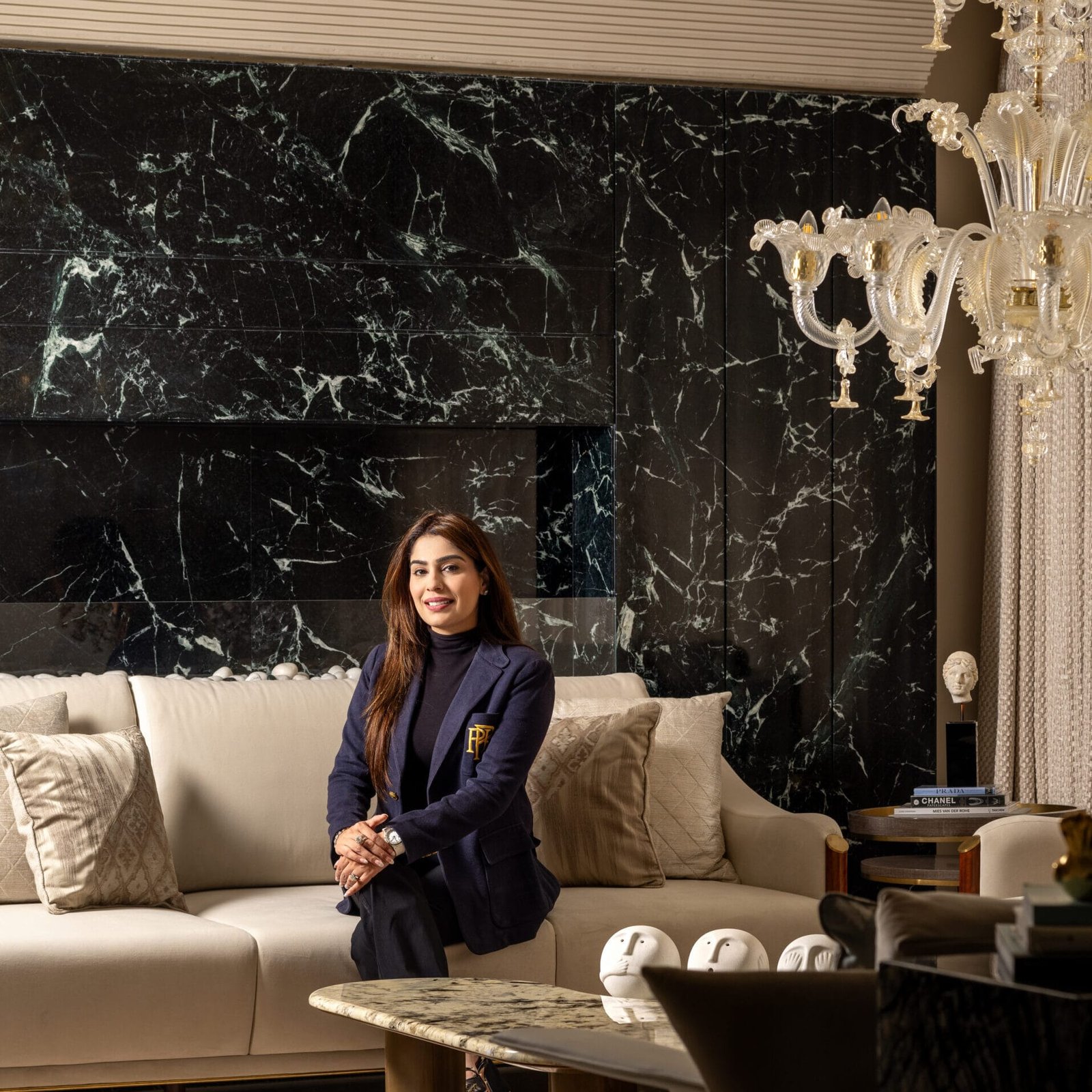 Entertaining was a key priority, which is evident in the sleek, sculptural bar area with rich marble textures and statement lighting. The living area was designed to feel plush and welcoming, with layered lighting, soft textures, and organic forms creating a warm, conversational ambience. A major highlight is the lobby, where bespoke craftsmanship comes alive through the inlay flooring with brass detailing and the artisan-crafted ceiling, reflecting the client’s appreciation for Indian handwork. Overall, the project captures a contemporary global sensibility with rooted Indian artistry, resulting in a space that feels bespoke, vibrant, and timeless. “Each zone, from the sculptural bar to the layered living area, is treated as a curated experience with its own identity, while maintaining a cohesive design language through warm neutrals, sculptural lighting, and bespoke detailing”, shares Parnika. The 12-seater grand dinning with customised quirky chandelier from Klove Studios, adds elegance to the space. This space has 3 buffet counters to assist the clients while hosting a big gathering of guests. A green and brown colour palette of the entertainment room lends a gentlemen’s club vibe feel to this space with antique accessories and black & white family portrait adding a vintage vibe. The family lounge has a bold colour combination of green and brown, breaking the monotony and giving a bolder look to the space. She further informs, “The bi-fold collapsible doors in the formal area helps divide the dining to drawing when needed and also when opened shows the expanse of the space. The lobby acts as a cultural focal point, celebrating Indian artistry with intricate ceiling handwork by Jaipur artisans and handcrafted brass inlays in the floor. Lighting plays a transformative role, with dramatic chandeliers and ambient glow elevating the mood. The project’s core concept was to create a luxurious yet soulful space where every room tells a story”