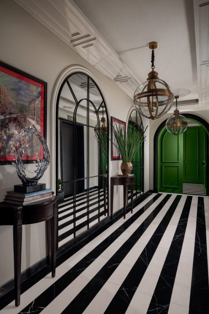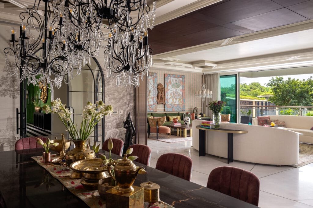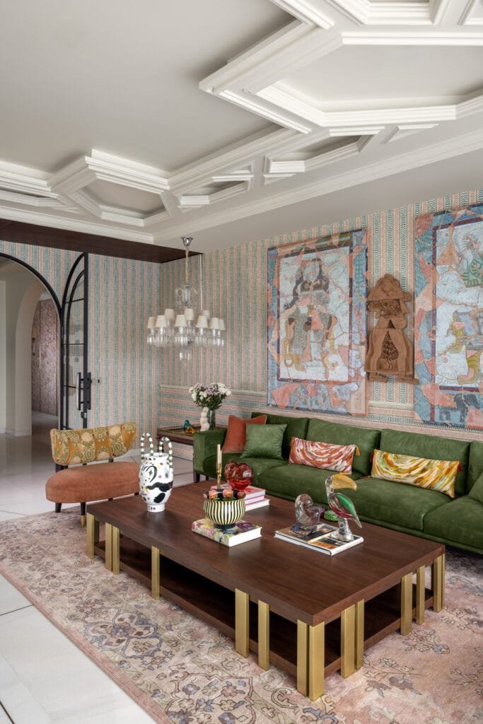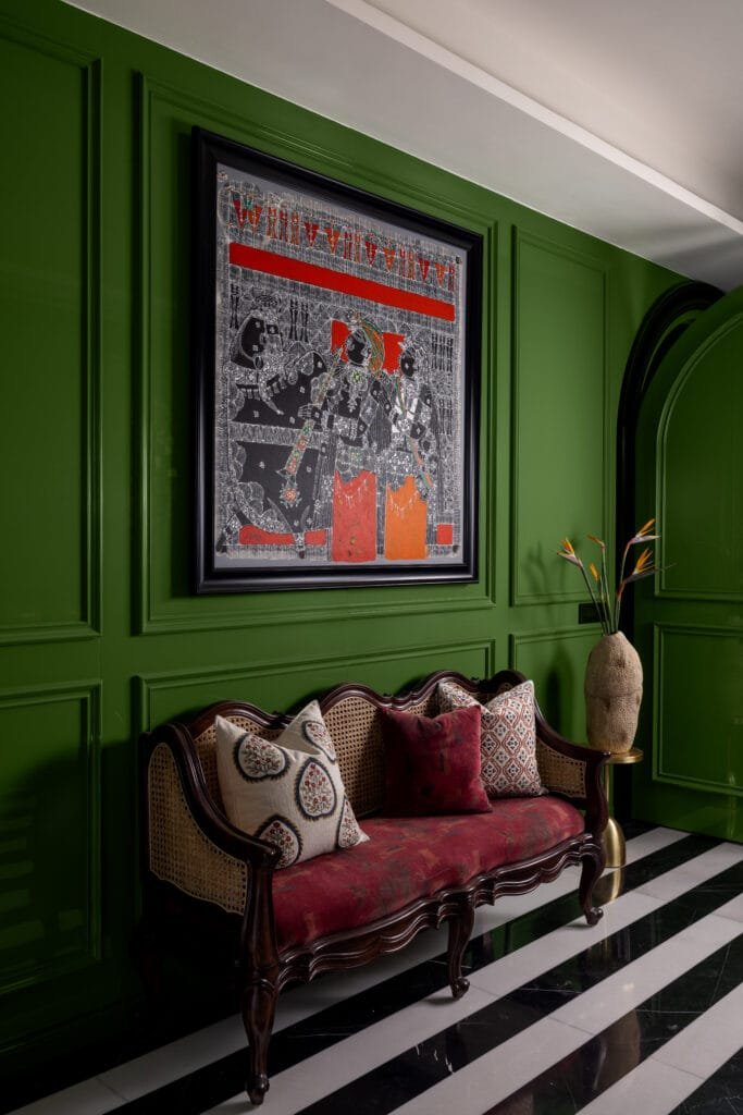 Spread over an area of 9,500 sq. ft. the residence’s journey inwards begins at the lift lobby, gently leading into a foyer wrapped in vivid green walls that reflects the home’s expressive spirit. To one side, the private wing unfolds into four suites, including two master suites, each shaped around the character of its inhabitant.