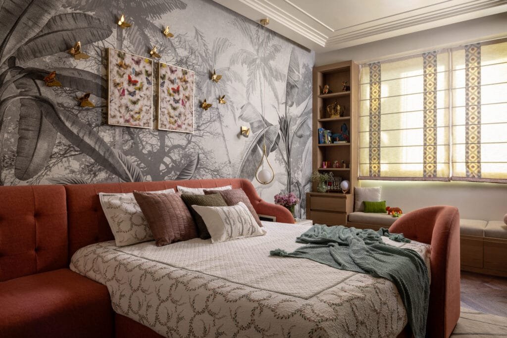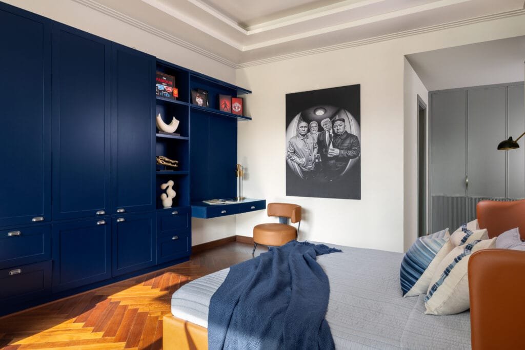 The master suite is rendered in a muted grey palette, its calm, composed atmosphere elevated by subtle classical detailing and a sense of symmetry. By contrast, the children’s bedrooms lean toward a more youthful, contemporary sensibility, shaped through cleaner lines and pared-back compositions. The daughter’s room introduces warmth through a terracottaupholstered bed set against monochrome botanical walls, with a small sitting nook shaped for her quieter moments. The son’s bedroom takes on a more masculine character with a tan leather bed sitting comfortably in the company of deep navy tones and metal accents.