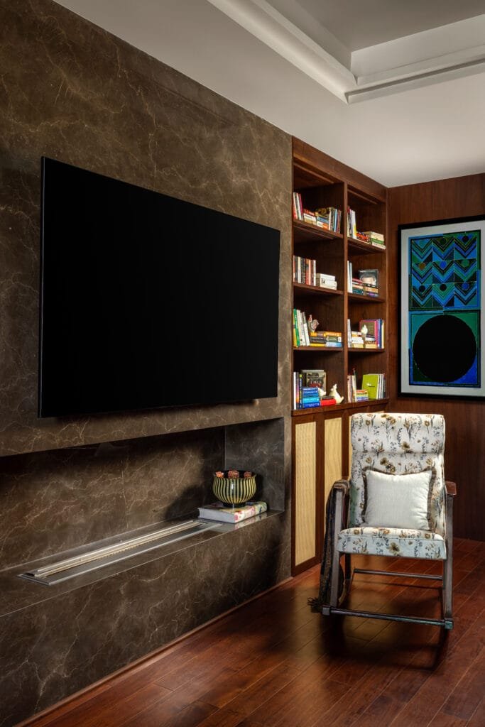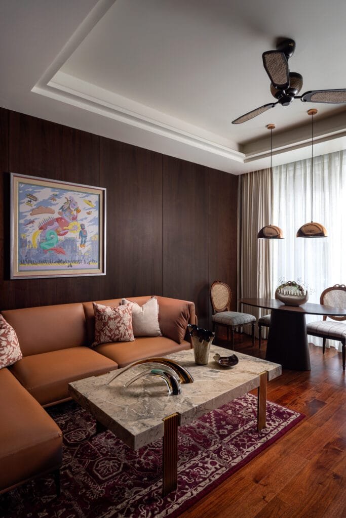 The family lounge unfolds with a warmer, more intimate character. Wrapped within the warm embrace of wood across walls and floor, it is anchored by minimal furniture forms that lend a sense of cocooning comfort. Against this calm backdrop, eclectic notes take their place as a framed Hermès scarf introduces a playful dash of luxury and handwoven textures soften the space.