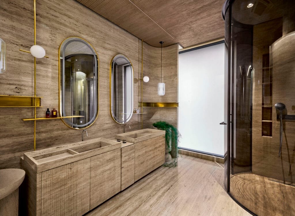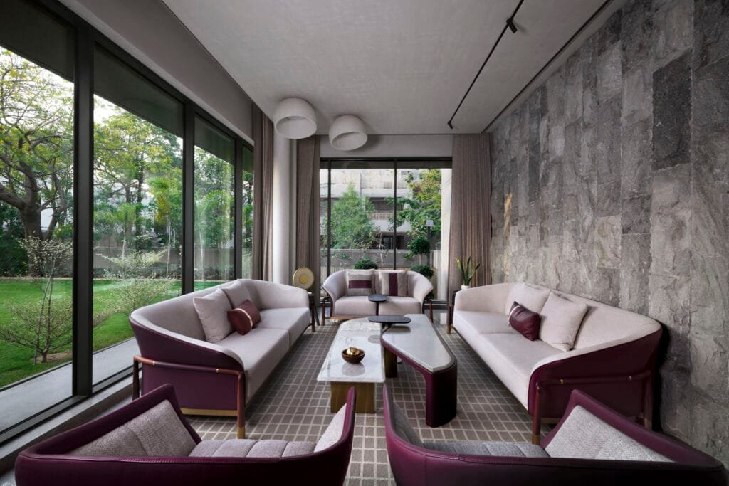 The party lounge seamlessly blends contemporary design with bold, playful accents. A striking textile art installation, featuring abstract bottle formations, adds a dynamic visual rhythm to the space. “This vibrant backdrop is complemented by muted tones, creating a harmonious contrast that is further enlivened by pops of colour in the vibrant red chairs and a captivating rug. The interplay of lines, forms, and colours brings the space to life”, says, Ramesh. Well-defined spaces are imbued with meaning through a balanced interplay of textures, thoughtfully chosen materials, and a harmonious blend of natural and artificial light. Sculptural elements and carefully curated decor pieces add a touch of artistic flair, culminating in a sophisticated ambiance that is both inviting and stimulating. The powder room features a stunning blend of organic forms and luxurious materials, with natural stone walls enhancing its sculptural quality. The highlight is a unique copper sink and faucet with an asymmetrical mirror. The luxurious bathroom showcases richly veined marble in soft whites, greys, and browns. The curved, fluted vanity adds fluidity, complemented by a modern brushed metal sink. The terrace offers a sophisticated outdoor seating area, mixing comfort with contemporary style. The open sky and distant cityscape create a picturesque backdrop for social gatherings or quiet reflection.