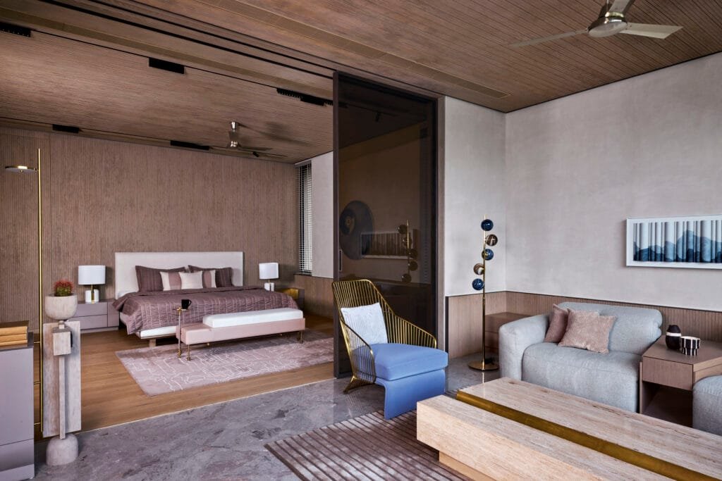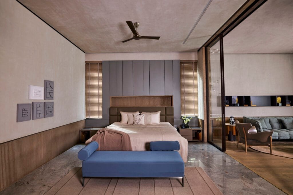 The living room exudes a luxurious yet cozy atmosphere. Explaining more about the design of the living area, Raghav says, “A subtle circular theme permeates the space, evident in the ceiling design and the round marble coffee tables. The deep, rich blue velvet sofa, a statement piece, offers a plush and inviting seating area. Neutral tones are softened by the curvilinear shapes of the furniture, creating a sense of fluidity and relaxation, while monochromatic cushions and a light throw offer contrast. Large windows flood the space with natural light, enhancing its airy and open feel. The artistic elements, including abstract sculptures and geometric wall art, add layers of visual interest and complete the design, creating a space that is both stylish and inviting.”