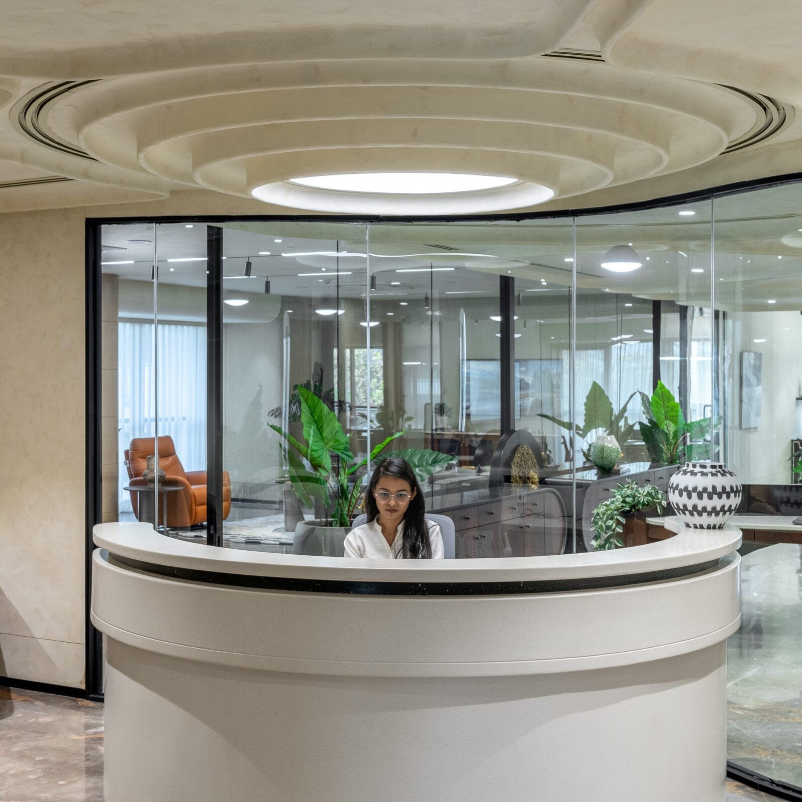 The top floor is reserved for the leadership team. Executive cabins and assistant areas are arranged around shared lounges and meeting points. Here, a sculptural ceiling installation, drawing from the principles of fluid dynamics, translates the company’s technical focus into a spatial expression. Custom-designed executive desks with sculpted bases further this narrative. Material choices are consistent throughout. Marble, screed, and concrete-finish tiles define different zones. Floor-to-ceiling glass partitions maintain transparency without disrupting spatial clarity. Ceilings integrate lighting into fluid forms, referencing the company’s background in fluid technology without overt symbolism.