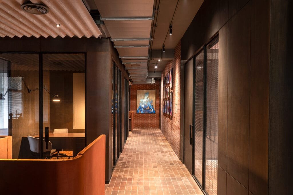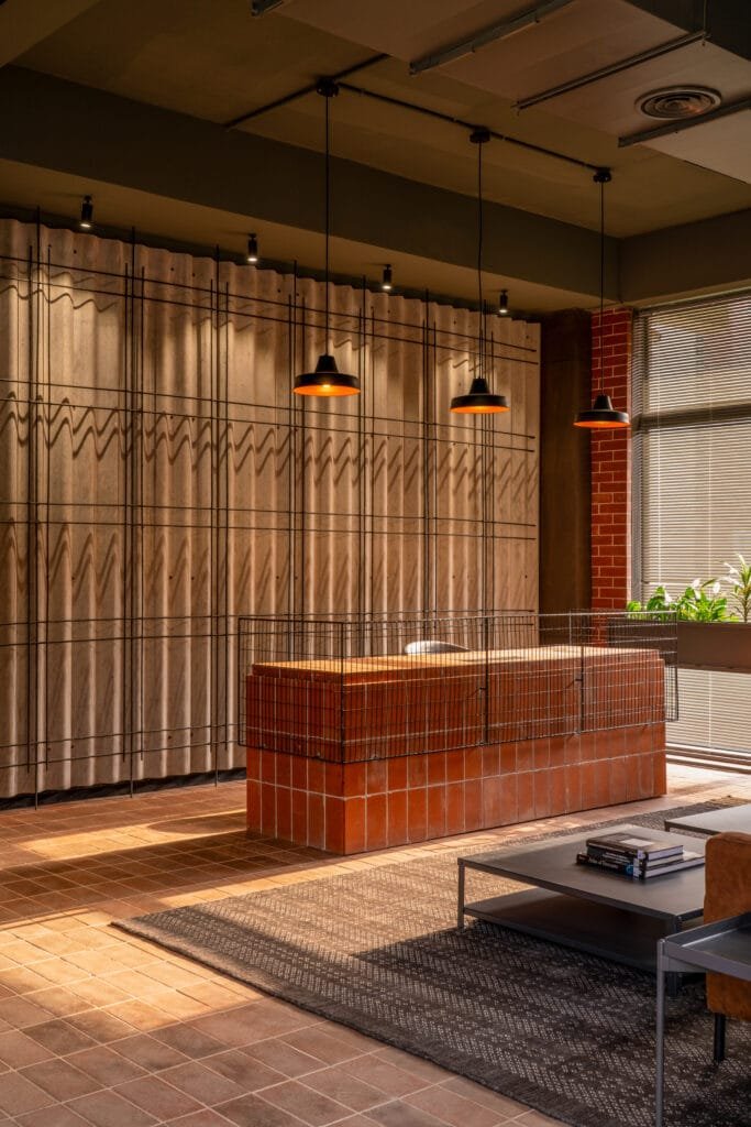 The project makes use of leftover site resources, integrating them into the spatial fabric. Salvaged bricks are reused to construct feature walls, surplus steel is reimagined as partitions and furniture, and corrugated cement sheets add texture and depth to the interiors. Smaller elements – such as extra wooden planks and metal fittings – are incorporated into built furniture and detailing, underscoring the project’s ethos of resourcefulness. Complementing this material-conscious approach, The Hub’s L-shaped layout optimises space, enabling smooth circulation and accessibility. The linear arrangement of offices facilitates movement, while designated zones for meetings and discussions establish a structured, professional setting. A balance of collaborative and private spaces, along with adaptable multi-functional areas such as conference rooms and lounges, enhances flexibility and usability. In essence, The Hub is more than a workplace – it is a sustainable, purposedriven environment that embodies innovation, collaboration, and thoughtful design.