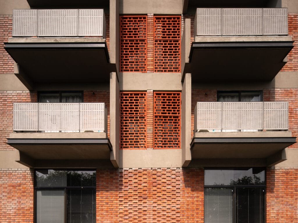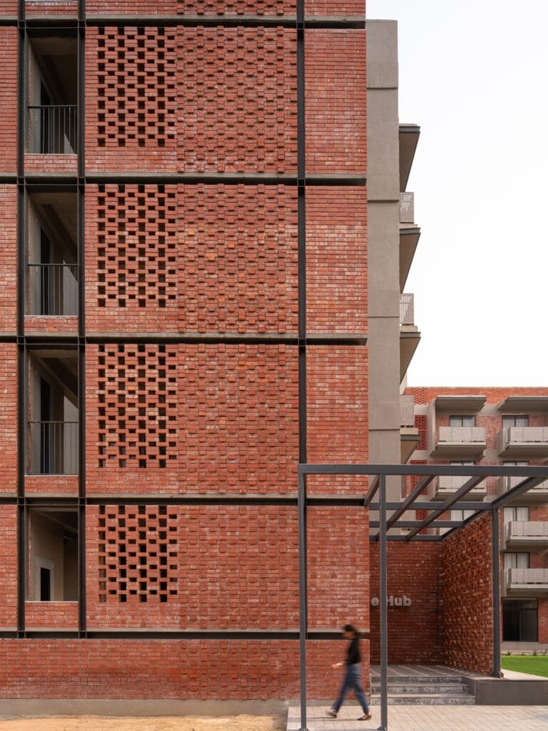 A defining feature of the accommodation is the use of exposed terracotta bricks for the façade, complemented by perforated jaalis. Fly ash bricks are used for the interiors, adding warmth, familiarity, and sustainable efficiency throughout.