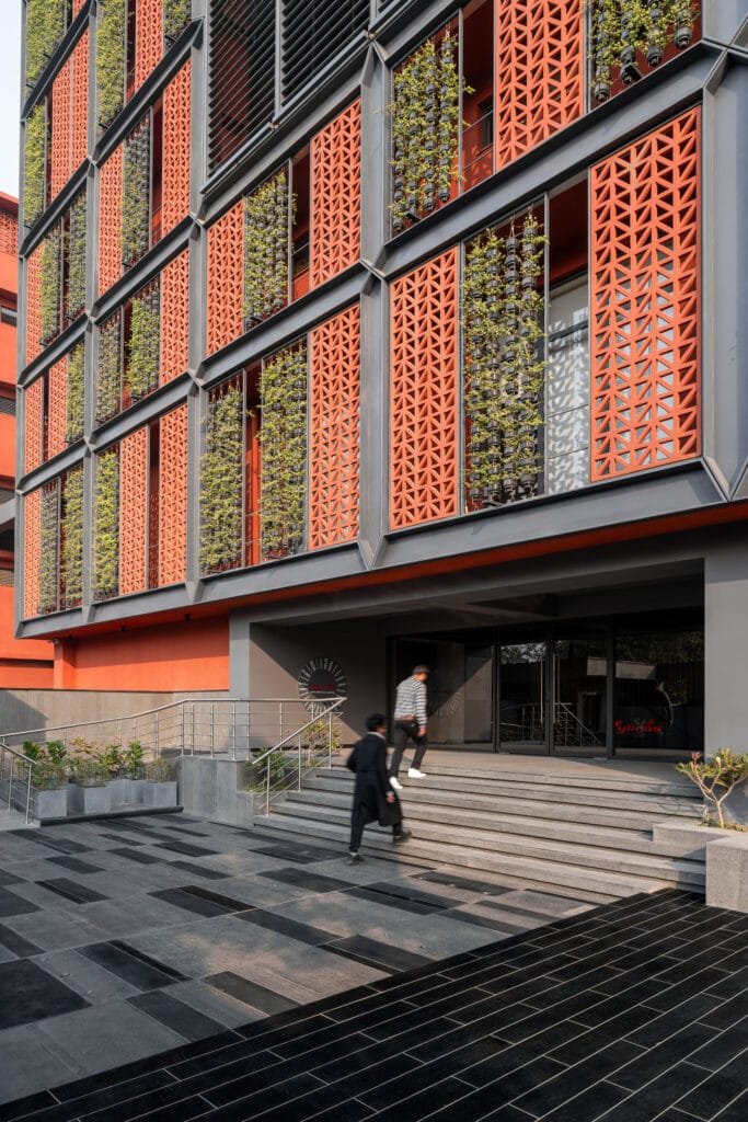 The client required a facility where loaded trucks could move easily, without affecting safe pedestrian access for office staff. This led to a two-block configuration. The warehouses open into a shared loading area between the two blocks. The workspace is situated on the second and third floors of one block. The building’s facade plays a key role in meeting the goals set by the design brief. The front facade faces West, which created the biggest design challenge. The building needed protection from the harsh summer sun but also required natural light for the office spaces. Ranju further adds, “On the West side, a double-skin facade features terracotta-coloured GRC lattices, mixed with vertical greens. This is supported by a grey metallic frame. A part of the facade has a curtain wall that lets natural light into the office areas. On the South side, deep projections frame large louvered windows. These let sunlight in while cutting down glare.” The facade helps create a healthy indoor environment and a strong public image. The greens-and-lattice grid blocks the harsh sun but allows fresh air to pass through. This filtered air improves natural ventilation.