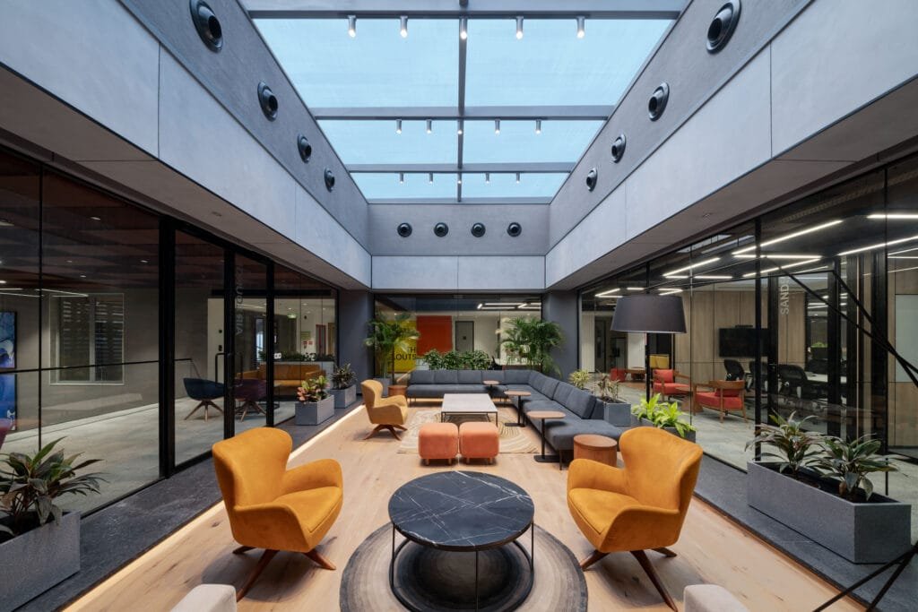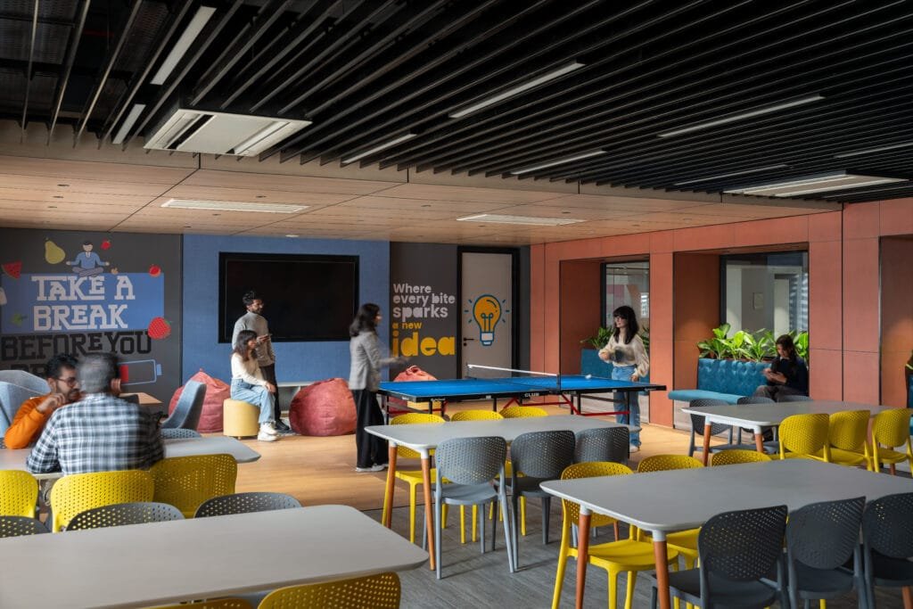 The design also connects the indoors with the outdoors. Occupants can enjoy pleasant views and soft breezes without facing the intense heat and dust common in the area. The design of the warehouse focuses fully on the comfort, convenience, and well-being of warehouse workers. Efficient circulation routes connect all work areas. Facilities like drinking water stations, toilets, and parking are planned for easy access. Loading bays are shaded with a metallic canopy. Balconies and refuge areas are also shaded to give workers places to rest away from the heat and hard work. Natural ventilation is promoted through louvered and screened facades, supported by large ventilators. The corporate workspace covers 36,000 sq ft across the top two floors of the South Block. It has a separate entrance and lift lobby, accessed through a pre-reception area on the stilt floor. This makes the office functionally independent from the warehouse. A defining feature of the workspace is the two courtyard-style lounges created under large skylights. These lounges have an outdoor feel, with wide views of the sky, abundant natural light, lush plants, and floors paved with wood, tiles, and decorative pebbles. The office design balances space efficiency with user comfort. It avoids typical high-density layouts by creating smaller clusters of desks. These clusters improve privacy, reduce noise, and boost productivity. Meeting rooms, breakout zones, discussion pods, and call booths are placed between the clusters, creating a lively mix of private and shared spaces. Recreational spaces are spread across both floors. From any desk, a lounge, café, or dining space is visible and easy to reach. This layout reinforces the idea of a workspace that values employee satisfaction as much as productivity.