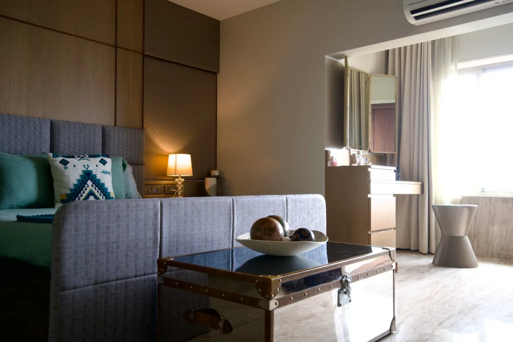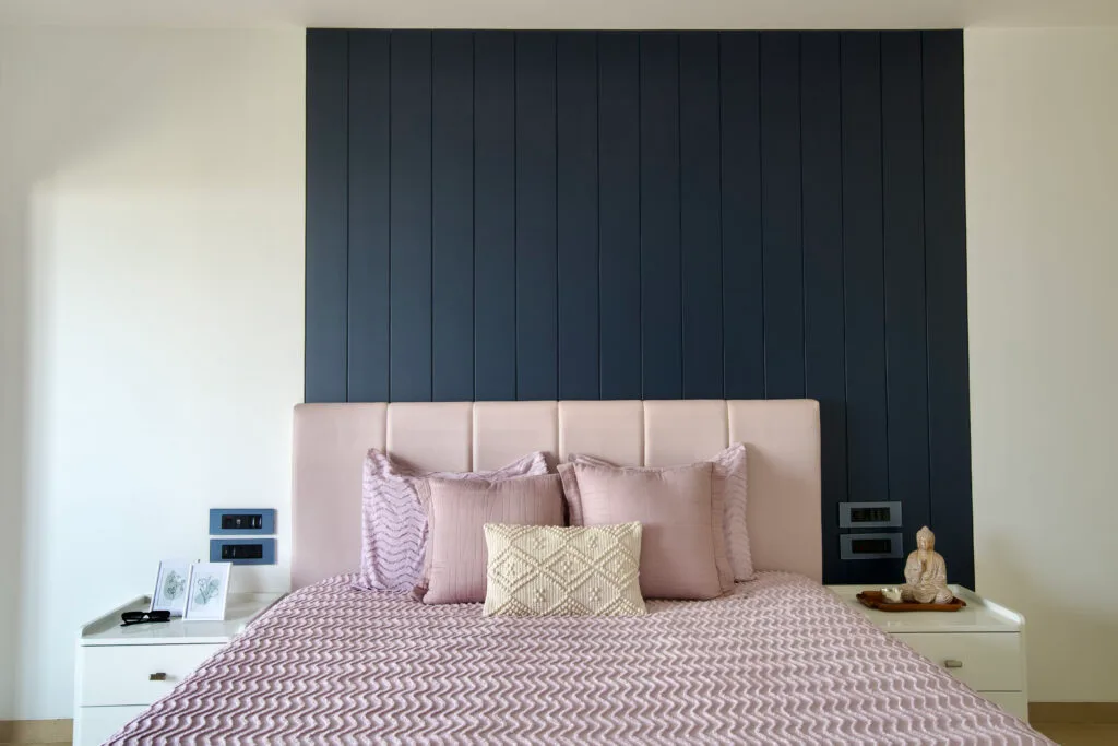 The son’s room is a sophisticated blend of brown, grey, black, beige, and a pop of green. The daughter’s room is bright and airy, with a serene colour palette of white, blue, and pink. The grandparent’s room is a timeless fusion of traditional and modern elements, featuring vintage-inspired mouldings, a deep orange accent wall, and a chevron-patterned veneer wardrobe.