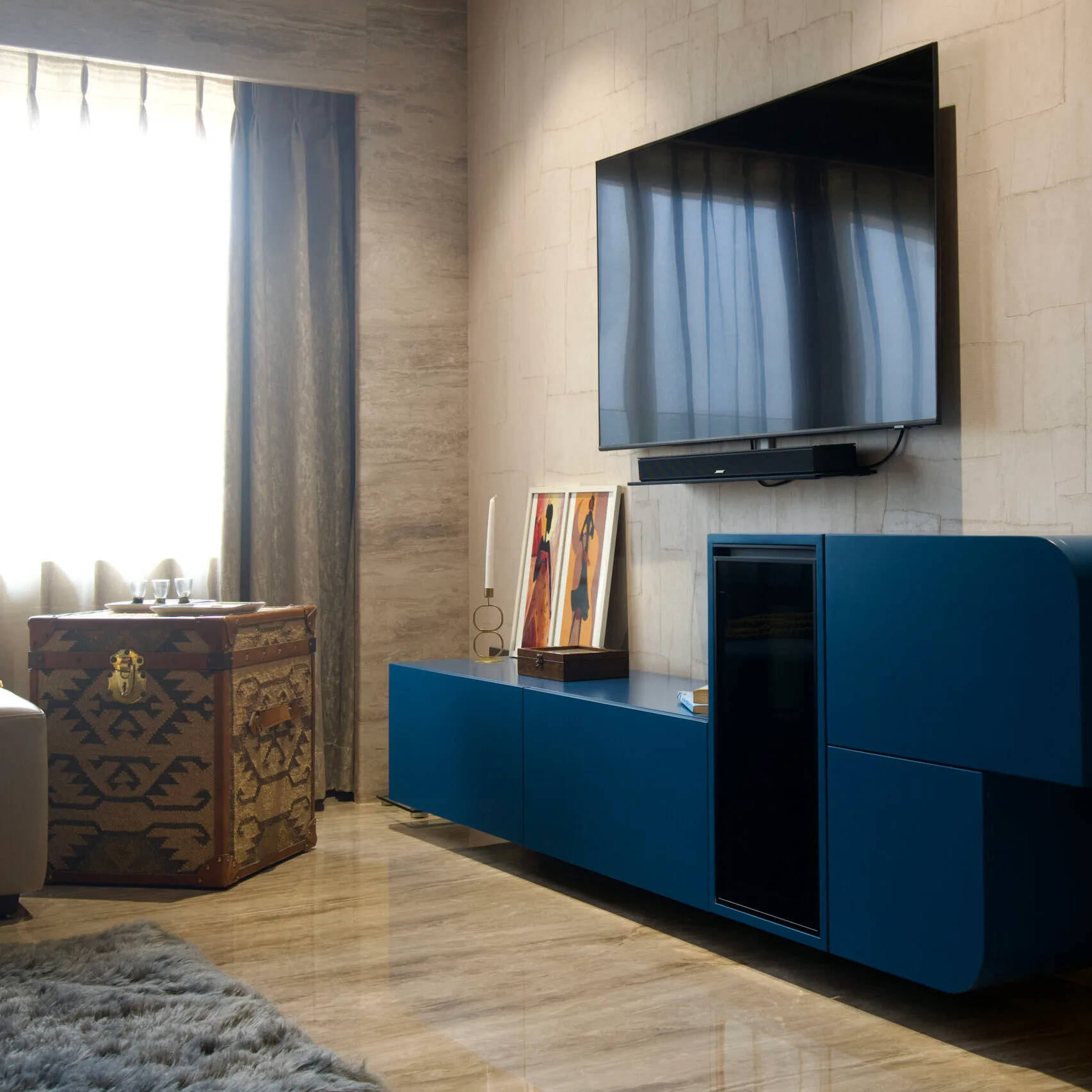 In the living area, a mix of printed and plain fabrics creates a cosy and inviting atmosphere. A stunning black faux leather centre table and a unique statement piece on the sleek black display unit elevate the space. A patterned veneer panel serves as a striking backdrop for the swing, enhancing the overall aesthetic. “Separated by a sliding door, the den offers a serene retreat. The blue TV unit with a statement marble leg support is a captivating focal point.
