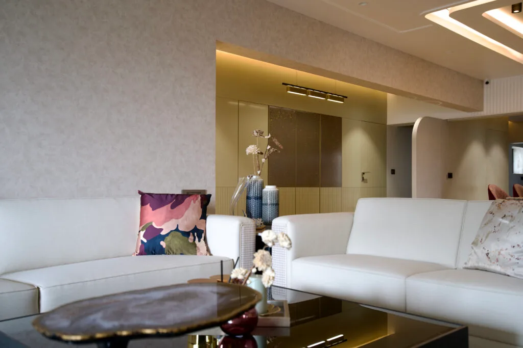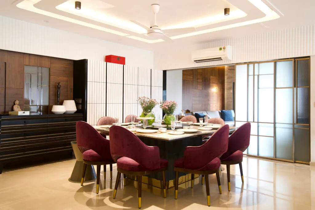 The expansive living and dining area exudes elegance and comfort. Neutral tones are punctuated by carefully selected contrasting elements. The eight-seater dining table, topped with a luxurious grey marble lazy Susan and supported by a fluted PU base, is a striking centrepiece. The purple chairs add a vibrant touch, while the ceiling design complements the table’s grandeur.