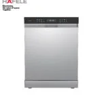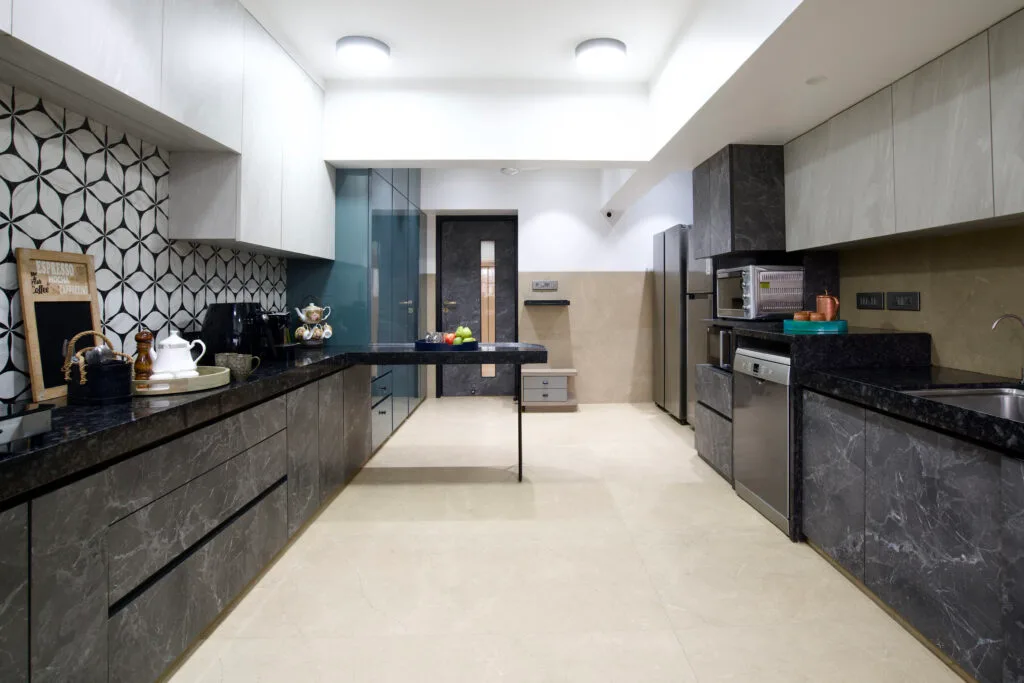 The kitchen seamlessly blends form and function. A sleek, minimalist design conceals ample storage within the flushmounted door. The interior, adorned with stunning green tiles and gold accents, offers a luxurious touch. A culinary delight, it features a stunning hexagonal flower-patterned tile dado as the focal point. Grey laminate shutters complement the tiles, while a deep sea-green accent on the tall unit adds a vibrant touch.