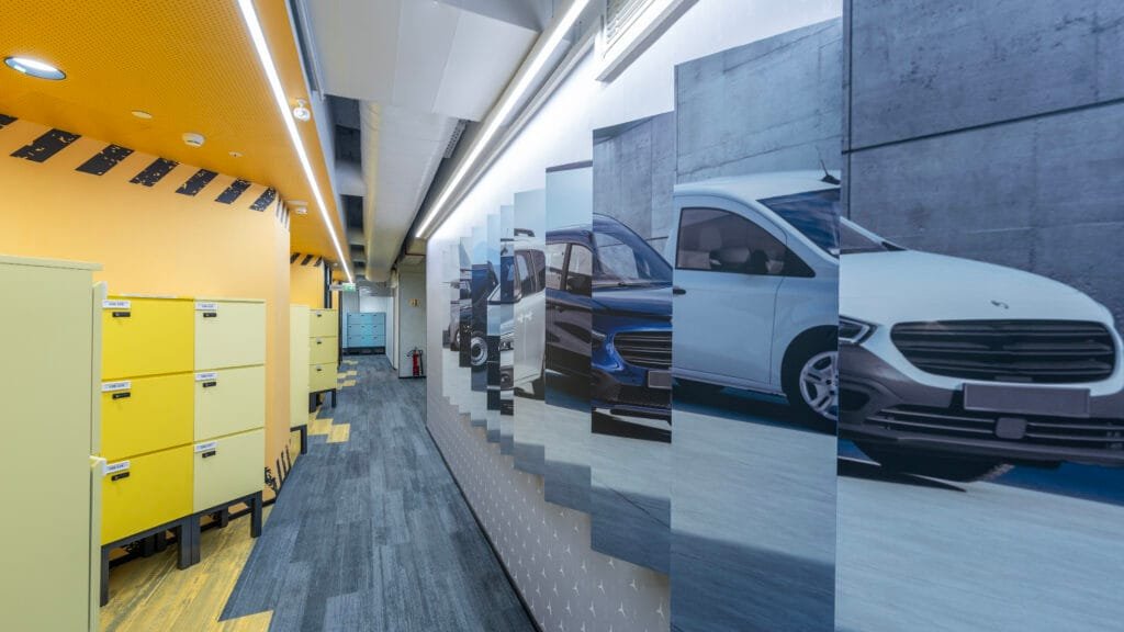 Visitors encounter the brand’s DNA the moment they step in. A precision-cut aperture in the glazed façade introduces a new vehicular ramp, allowing cars to be driven directly from grade level into the first￾floor reception and the test bay. Around this dramatic entry point, a compact figure-of￾eight layout accommodates labs, wellness rooms, and breakout zones, ensuring engineers can transition seamlessly from laptops to lift jacks.