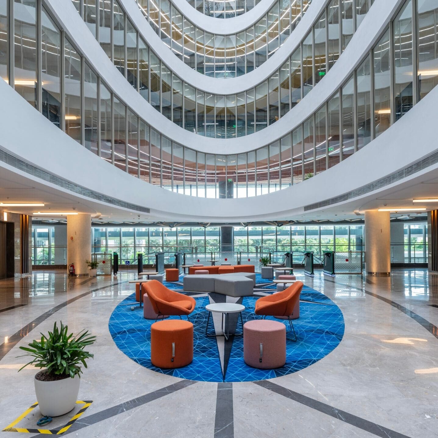 A soaring eight-storey atrium slices through the heart of the building, flooding deep floor plates with daylight. Its radial geometry is echoed in curved gypsum forms and custom pendant lighting rings, reinforcing a subtle sense of motion throughout the interiors. The community spaces cluster around this luminous void, making it both the symbolic and functional core of the workplace.