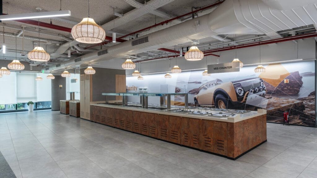Vestian was appointed to deliver a 2.55 lakh sq ft fit out across the first to fifth floors within 120 days, while the landlord’s base build works were still in progress. The shell, a LEED‑Platinum SEZ block, offered deep floor plates, generous floor‑to‑floor heights, and a glazed North‑South façade—yet came with the logistical tangle of installing a full-scale indoor car-test bay and working to a lean interiors budget. “Early design explorations leaned toward a motorsport-inspired narrative. Concepts such as grandstand-like step seating around the atrium, tyre-mark graphics sweeping across the floors, and rear-view mirror claddings in pantries were envisioned. While budget and time compressed the scope, the essence of that vision—termed the Gear Up Garage—remains. The first-floor car-display and test bay, lighting rings tracing circulation paths, and colour-blocked neighbourhood cores preserve the energy and dynamism of the original concept while aligning with everyday workflows.”