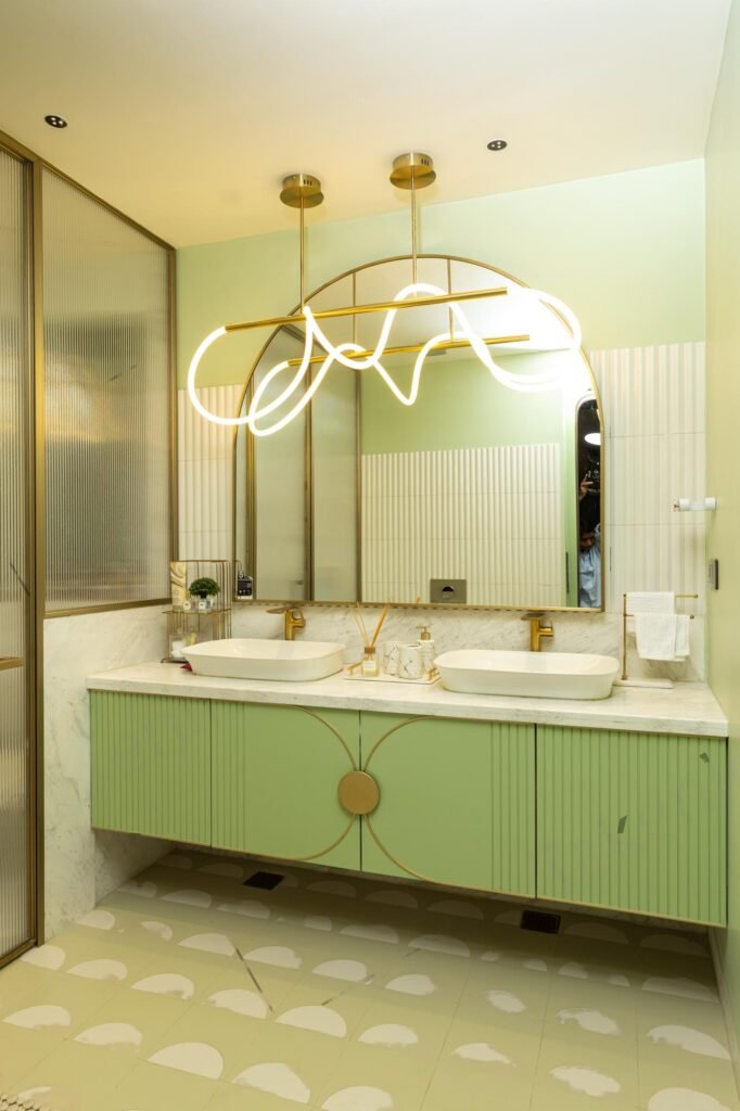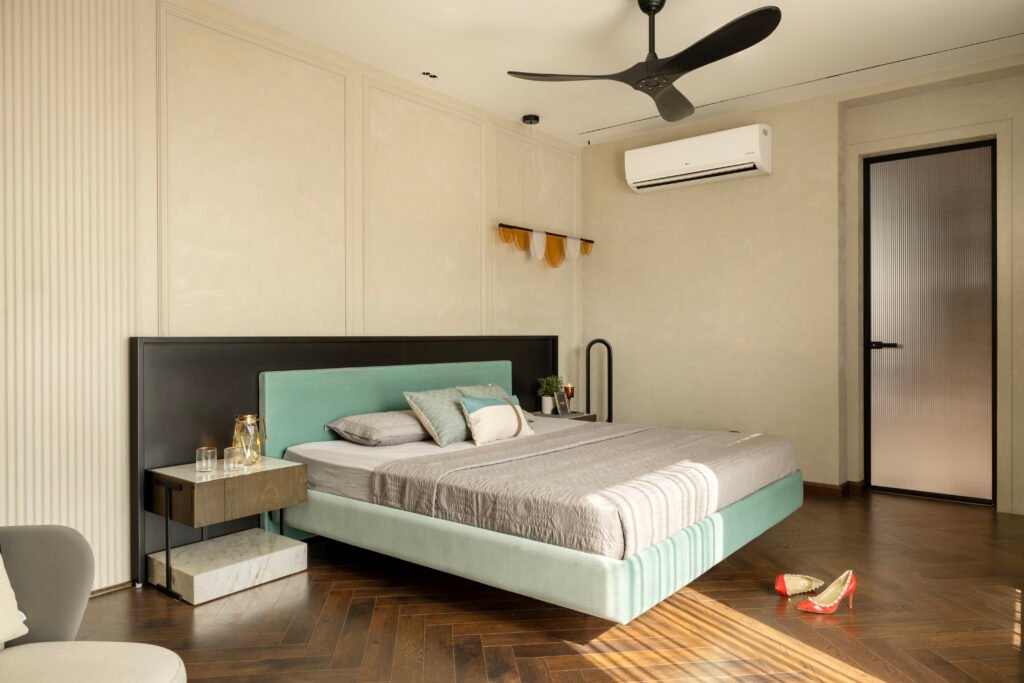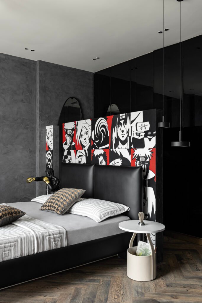 Transitioning into the private zones, each bedroom narrates its own story through materiality and mood. One room embraces tranquility through clean lime-plastered walls and pastel green accents — an embodiment of the home’s understated design language. The next room radiates vibrancy with pastel pink and magenta hues, bringing a bold yet refined energy. Here, fluted glass shutters and a floating dresser introduce a touch of sophistication while reinforcing a sense of lightness. The third bedroom, designed for a younger occupant, channels a playful yet edgy vibe. Anime-inspired graphics adorn the walls, while deep blacks and cool greys lend depth and drama, creating a contemporary retreat infused with individuality. The bathrooms, adorned with Grohe fixtures and freestanding basins, continue the theme of elevated simplicity — brass details and clean lines merging to form a refined aesthetic.