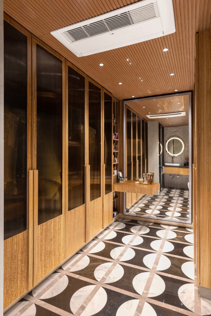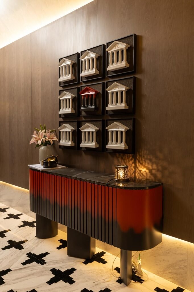 The design journey begins at the entrance lobby, where warm lighting softly highlights the plain lime-plastered walls, evoking an immediate sense of calm. The marble inlay flooring adds a note of opulence, while the gracefully arched ceiling enhances verticality and flow. A striking red console, complemented by decor pieces inspired by classical miniature columns, introduces an unexpected yet tasteful burst of personality — setting the tone for the spaces that follow.