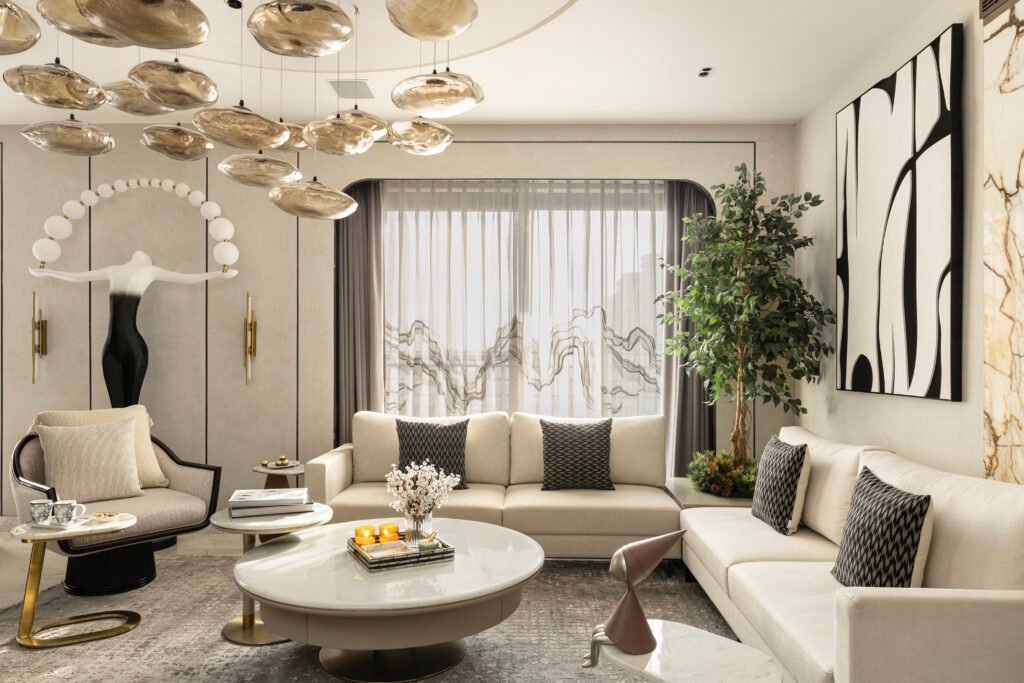 Adjacent to the living room lies the dining area, demarcated by a floating screen that maintains visual connection while defining zones. Under the glow of a cascading chandelier, the dining table takes centre stage — exuding elegance and refinement. Gentle curves replace sharp corners, softening the visual language and inviting comfort. A palette of warm beiges paired with brass fixtures enhances the sense of restrained opulence, while the thoughtful composition of textures underscores the studio’s mastery in achieving minimalist luxury.