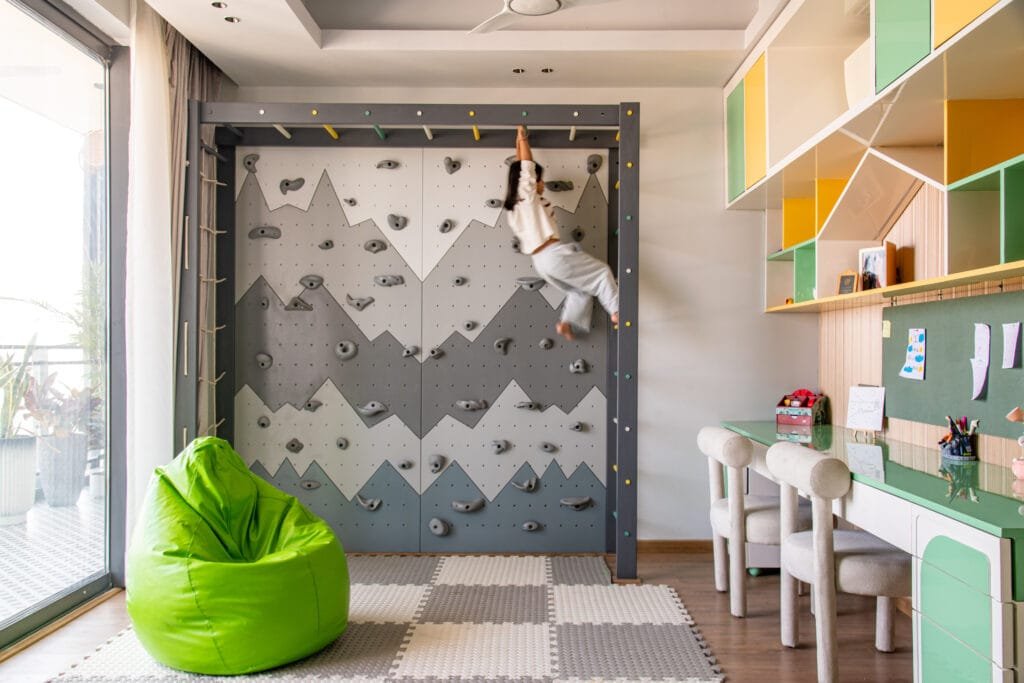 While the formal areas lean into sophistication, the home embraces playfulness where it matters most. The children’s playroom is a burst of colour and imagination, complete with a wall-climbing installation and an energetic palette that encourages creativity.