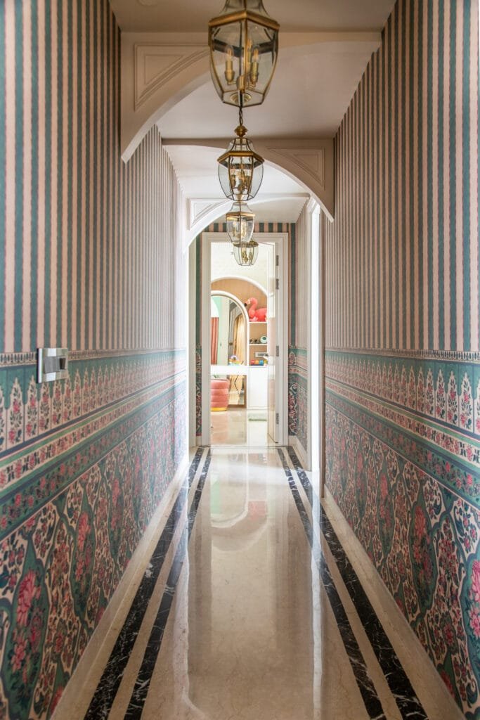 The arrival sequence sets the tone. Arched passageways lend architectural rhythm and recall European classical influences, while lantern-style lighting casts a warm, intimate glow. Intricately patterned Sabyasachi wallpapers add depth and cultural nuance, layered thoughtfully so they enrich the space without overwhelming it. The palette is luxurious yet eminently liveable—warm neutrals offset by deep jewel tones, marbles with gentle veining, and brass accents that shimmer subtly.