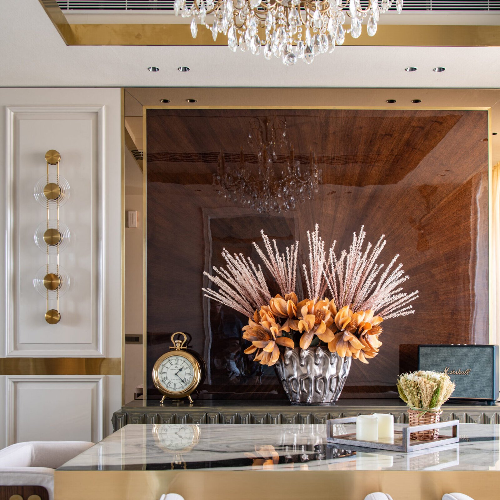 Marble plays a starring role throughout Terra Platinum, extending beyond flooring to wrap around furniture, define the bar area, and form sculptural statement walls. Its continuity anchors the home’s grandeur while lending it a timeless quality.