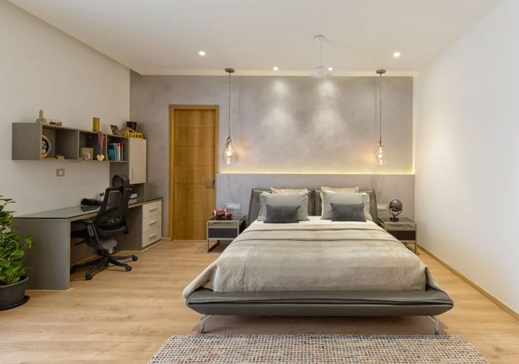 A wooden paneled corridor leads one to the dining space with sleek niches on one side displaying curios while a delicately carved doorway to the puja room on the opposite side, moving on to the covered sit-out or rather the Alfresco Dining and informal living room. The dining area in shades of beige has a six-seater marble top table, which reflects warmth and comfort through the wooden textures that are part of the ceilings and walls. The eclectic lighting design is an unconventional choice for a dining space that attracts all the attention. The space extends to the semi-covered patioAlfresco dining, through a sliding glass partition, together forming a gathering zone in the house. Here the stress is on the outdoor and casual feel, thus the rattan texture furniture. The informal living room further down is again in grey palette. Stone grey wall and flooring, partly wooden cladded walls, beautiful wall art, and comfortable seats all together create a cosy and warm ambience. The bedroom on this floor is warm and comfortable. The compact kitchen area is well equipped and skillfully planned to accommodate every necessity of a modern kitchen. The wellorganized storage and strategically placed kitchen island make the kitchen look spacious as it seamlessly extends to the dining room. A stairway and lift lead to the private quarters of the family. This space encloses a classically designed family room, the master bedroom, the daughter’s bedroom and the son’s bedroom apart from the open terrace and Jacuzzi. One experiences a feeling of serenity and tranquility while entering the master bedroom. The calm private sanctuary of the couple in a subdued grey palette speckled with the subtle glitter of brass. The textured walls, along with the customized pendant lighting hanging above the bedside tables all add character and give the space a visual interest. The full-size windows sweeping the walls bring in plenty of natural light.