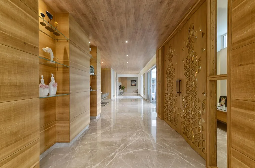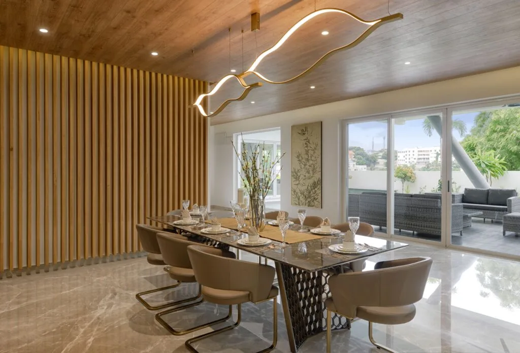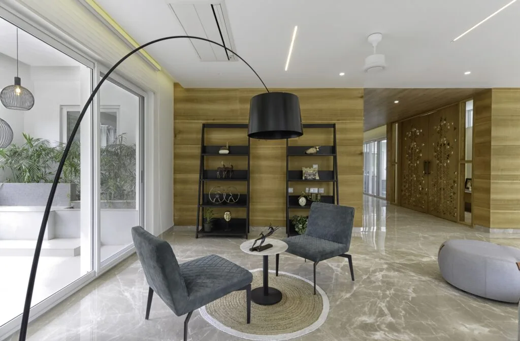 The home is planned at two levels with the entire ground floor connected by a spacious vestibule and different spaces are set in from this passage. The route from the innermost family living space through the dining area and the covered sit-out towards the puja room and the formal drawing room provides an experience that is delightful and engaging for the residents. The design process began by clearly marking out spaces –formal, informal, dining space, sit-outs spaces. Entering the massive doorway, the formal drawing room in a grey palette spreads across a large space lending a sense of luxury and sophistication. Chic style comes across through the light wooden panelling along the length of the wall works and marble flooring. Nature seems to flow abundantly through the large glazing that pours plentiful of natural light into the space. The smart extended seating arrangement allows for entertaining guests, which makes it a vibrant social space. A secluded corner with comfortable seats, an attractive display rack, and a hanging light becomes a cosy reading corner. On the whole, the space is tastefully elegant. An exclusive water body is located near the semi-covered patio and can be viewed from the living area and terrace. As are the other outdoor areas, the water body is also planned with climatic and contextual factors in consideration.