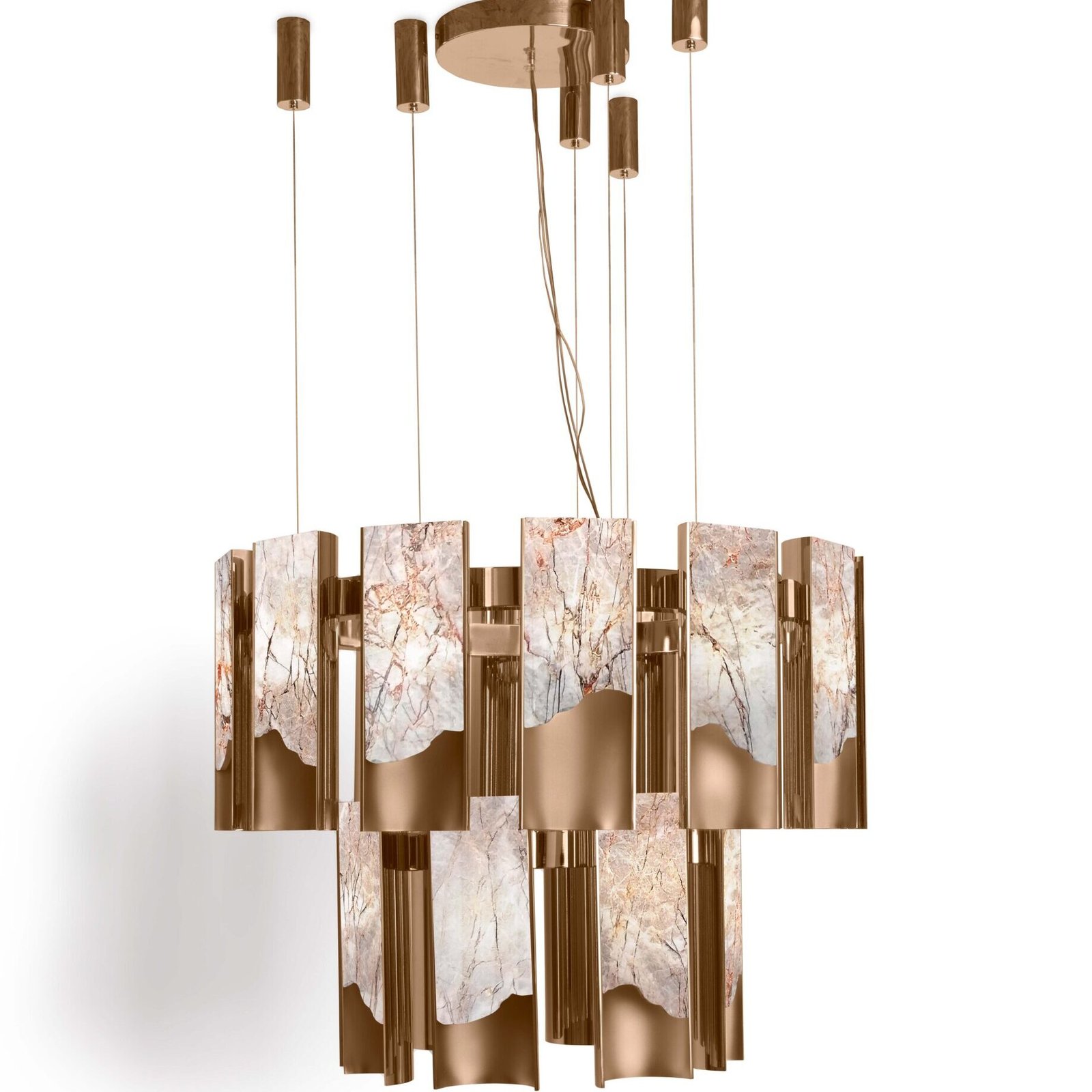 The Polaris lighting, designed by Alessandro La Spada, is an example of craftsmanship and modularity, resulting in a unique yet reproducible creation. The circular chandelier is defined by the combination of individual concave aluminium elements, each completed with an organically cut onyx diffuser. This sophisticated chandelier seamlessly merges the technological and natural worlds, creating a harmonious interplay of materials and light.