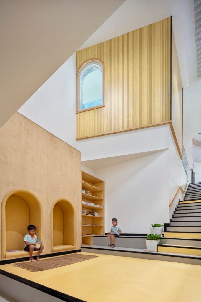 The overall foundation of the design lies in creating spaces that spark curiosity and connection. Wide internal staircases, referred to as the ‘Learning Stairs,’ were introduced into the early years zone to serve as both circulation and as informal zones for gathering, interaction, and reflection. Every design move is underpinned by the intent to enhance the student experience through spatial storytelling.