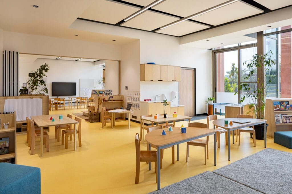 The stairs and cloisters feature bare elements, such as brick and concrete, that are carried in from the exterior, while natural materials, like granite and marble, cover the interior floors. A warm, neutral material palette, highlighted by natural wood and brick, infuses the interiors with a sense of timelessness and comfort. For the Early Years and Primary Years zones, the material palette is warm, soft, and calming, intended to evoke a sense of home and security. Intimate volumes with playful design elements are tailored to meet the children’s developmental needs with open plans for internal transparency, passive monitoring and ease of movement.